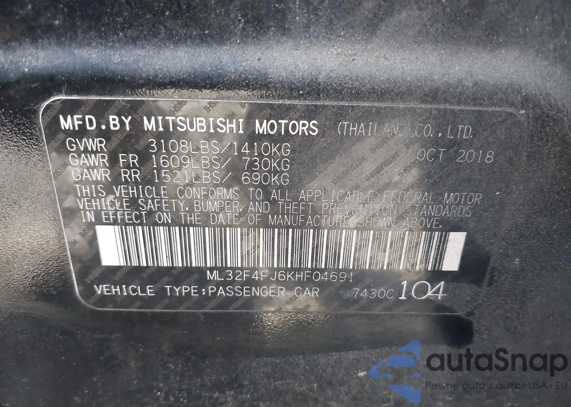 Samochód Mitsubishi Mirage 2019 (VIN ML32F4FJ6KHF04691) nie był wcześniej licytowany. Dokumenty są czyste, przebieg odpowiada lub jest niższy niż średnia rynku. Sprzedaje go firma ubezpieczeniowa – polecamy zakup. Dostawa do portu zajmie ok. 6–8 tygodni.