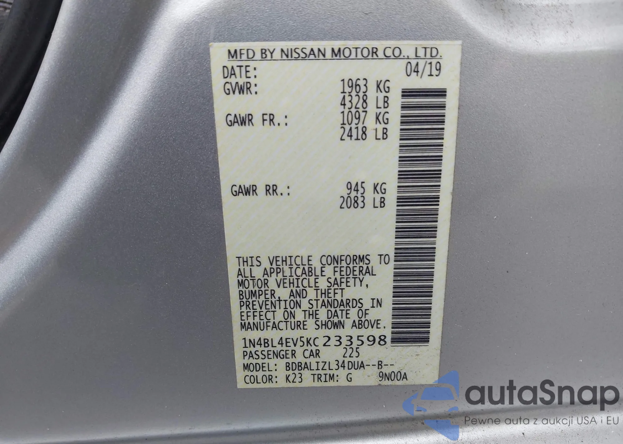 VIN: 1N4BL4EV5KC233598