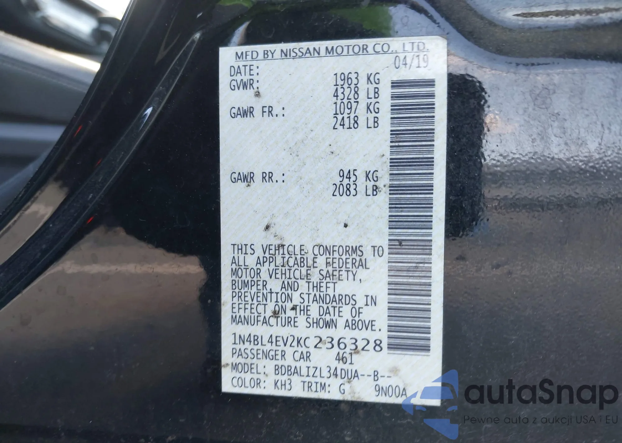 Samochód Nissan Altima 2019 (VIN 1N4BL4EV2KC236328) nie był wcześniej licytowany. Dokumenty są czyste, przebieg odpowiada lub jest niższy niż średnia rynku. Sprzedaje go firma ubezpieczeniowa – polecamy zakup. Dostawa do portu zajmie ok. 6–8 tygodni.