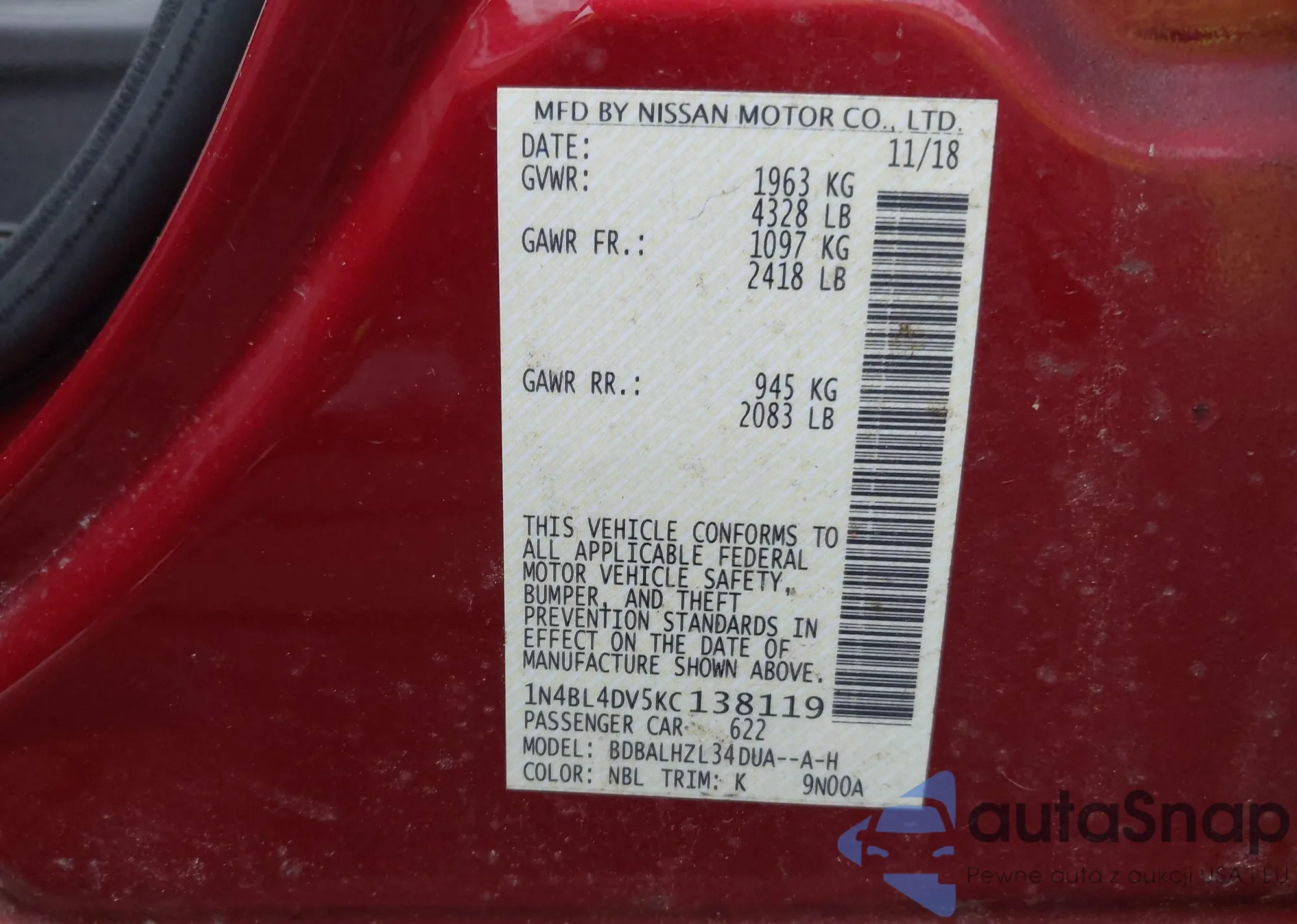 VIN: 1N4BL4DV5KC138119