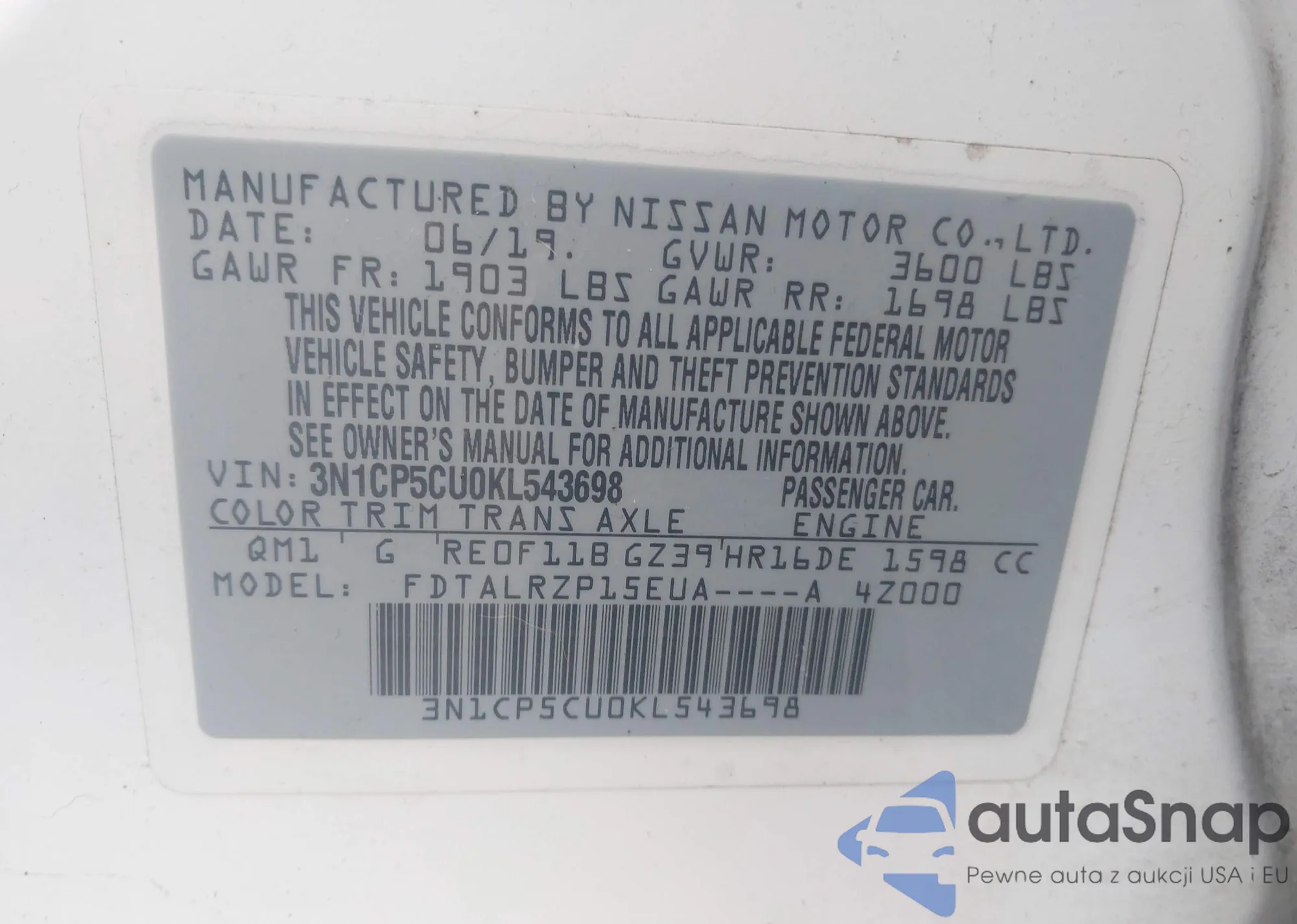 Samochód Nissan Kicks 2019 (VIN 3N1CP5CU0KL543698) nie był wcześniej licytowany. Dokumenty są czyste, przebieg odpowiada lub jest niższy niż średnia rynku. Sprzedaje go firma ubezpieczeniowa – polecamy zakup. Dostawa do portu zajmie ok. 6–8 tygodni.
