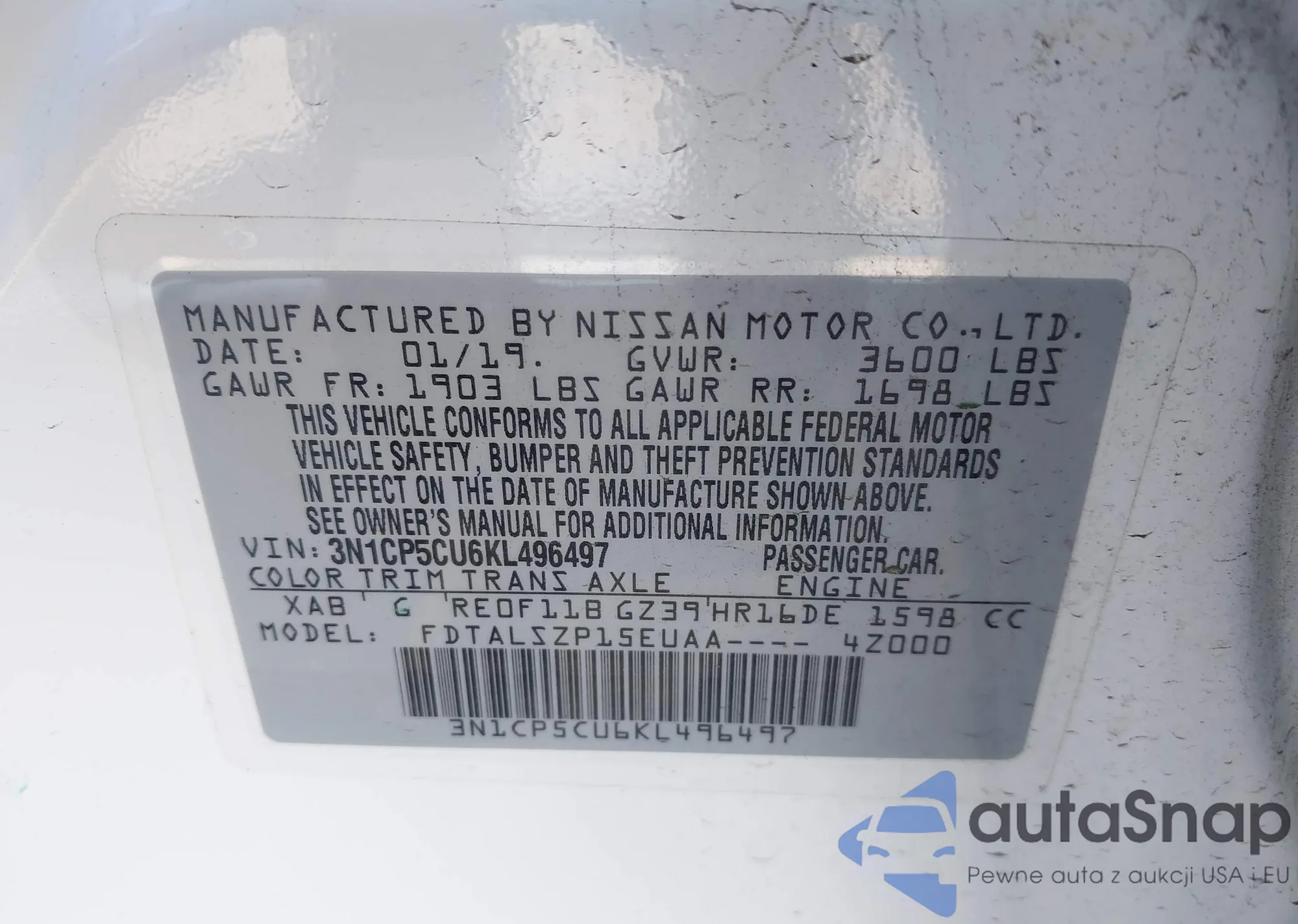 VIN: 3N1CP5CU6KL496497
