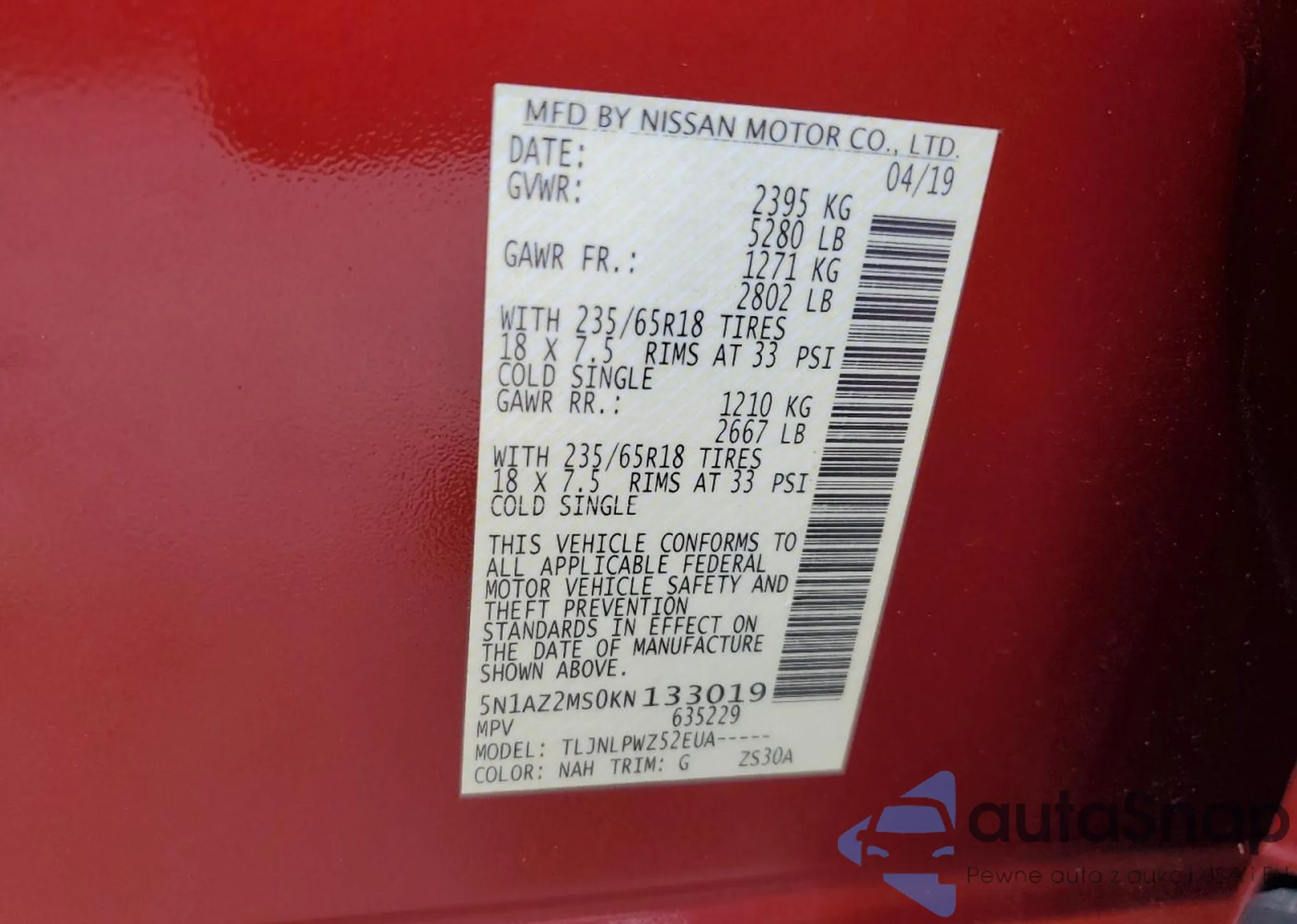 VIN: 5N1AZ2MS0KN133019