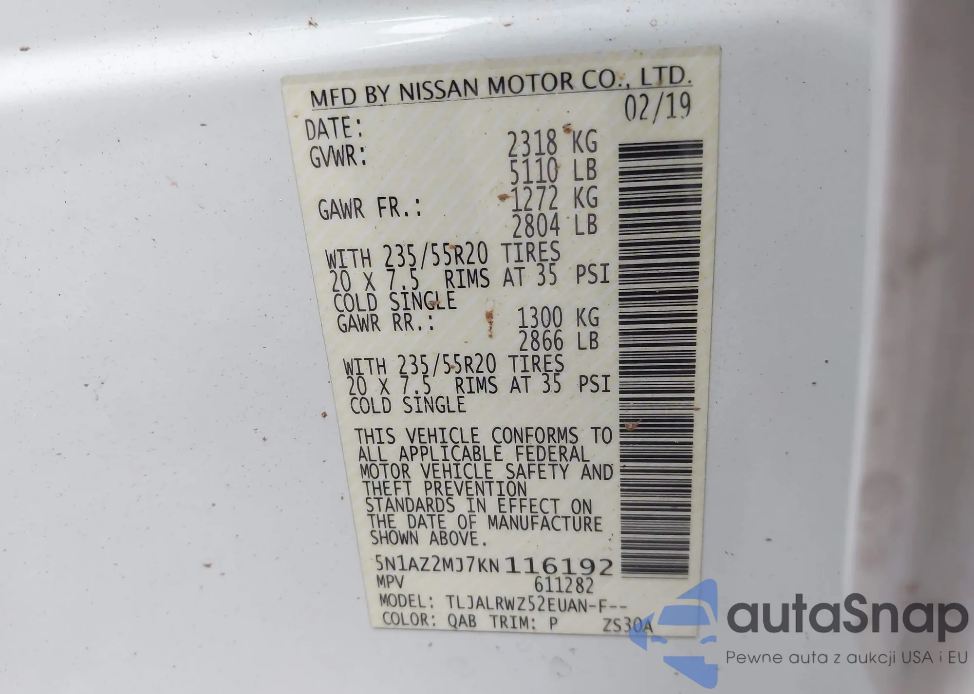 Samochód Nissan Murano 2019 (VIN 5N1AZ2MJ7KN116192) nie był wcześniej licytowany. Dokumenty są czyste, przebieg odpowiada lub jest niższy niż średnia rynku. Sprzedaje go firma ubezpieczeniowa – polecamy zakup. Dostawa do portu zajmie ok. 6–8 tygodni.