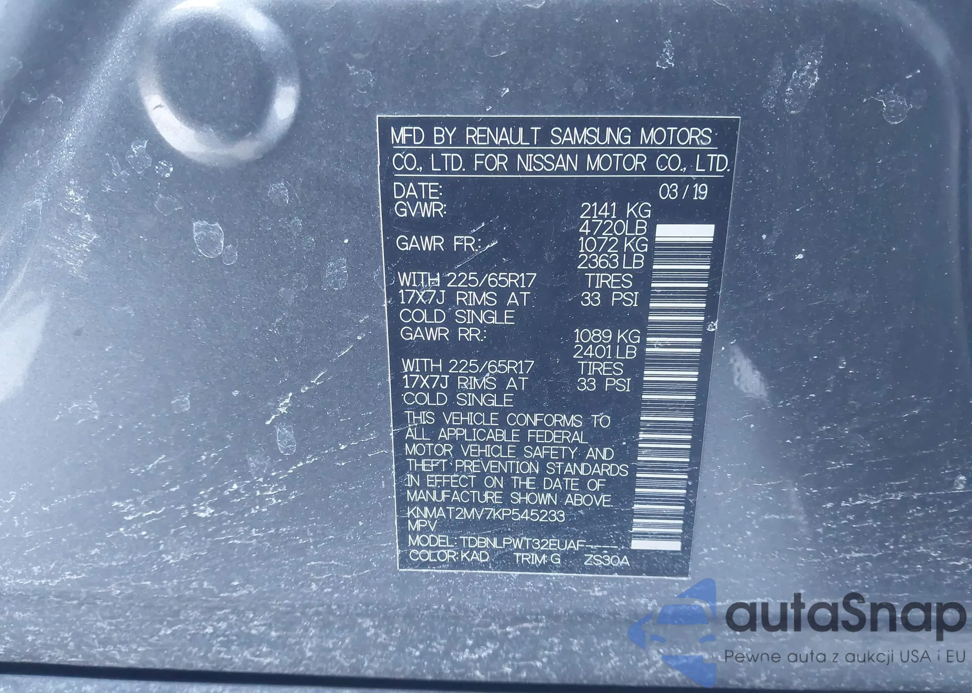Samochód Nissan Rogue 2019 (VIN KNMAT2MV7KP545233) nie był wcześniej licytowany. Dokumenty są czyste, przebieg odpowiada lub jest niższy niż średnia rynku. Sprzedaje go firma ubezpieczeniowa – polecamy zakup. Dostawa do portu zajmie ok. 6–8 tygodni.
