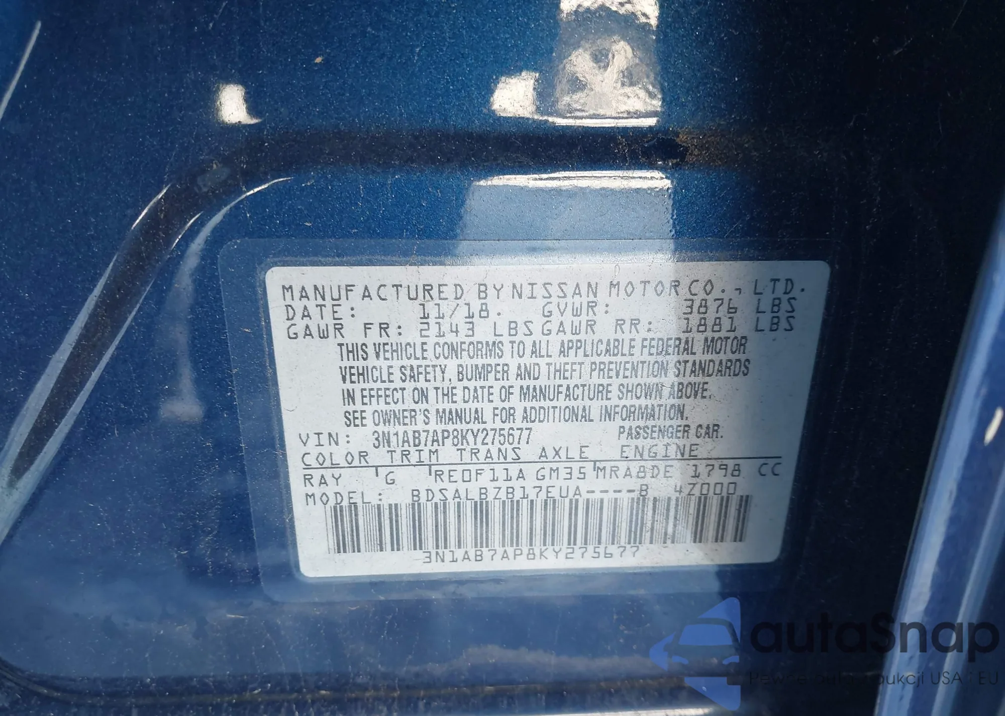 Samochód Nissan Sentra 2019 (VIN 3N1AB7AP8KY275677) nie był wcześniej licytowany. Dokumenty są czyste, przebieg odpowiada lub jest niższy niż średnia rynku. Sprzedaje go firma ubezpieczeniowa – polecamy zakup. Dostawa do portu zajmie ok. 6–8 tygodni.