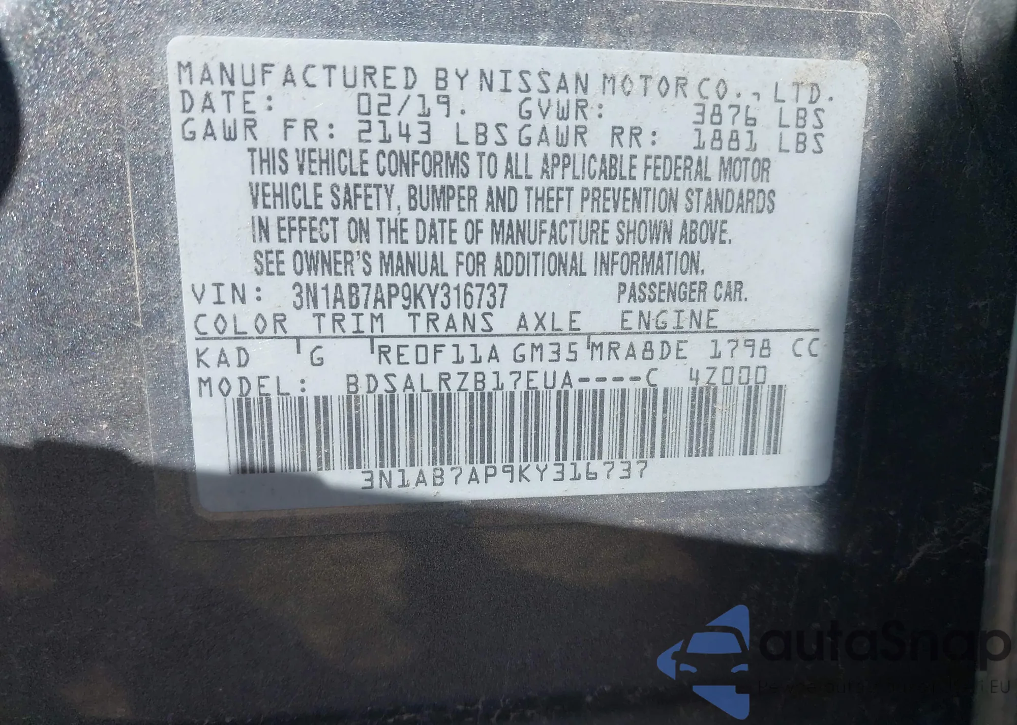 VIN: 3N1AB7AP9KY316737
