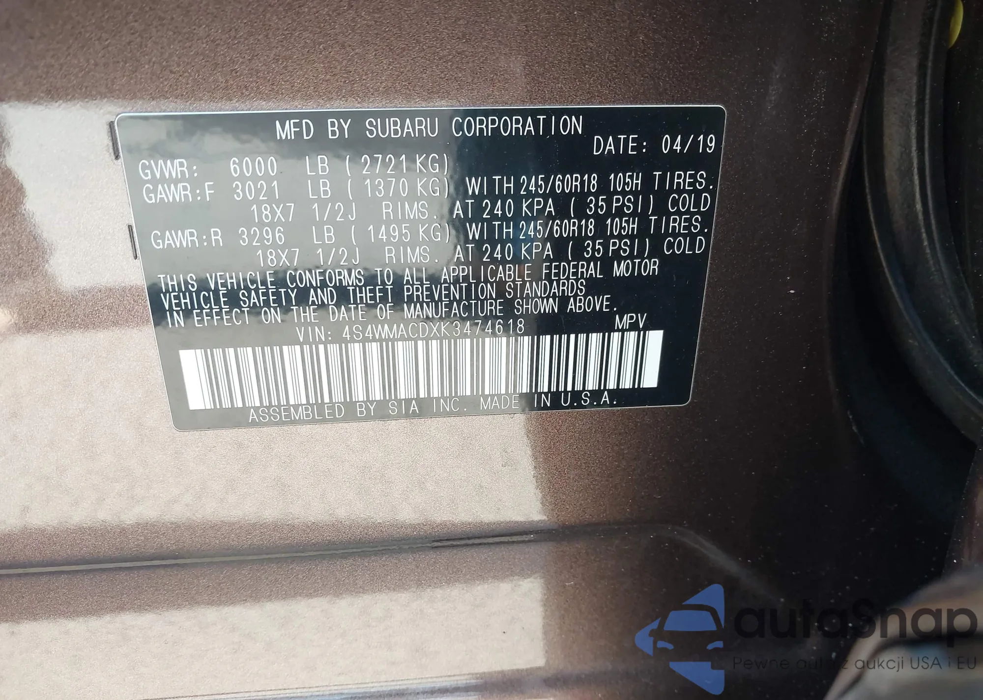 • VIN: 4S4WMACDXK3474618
