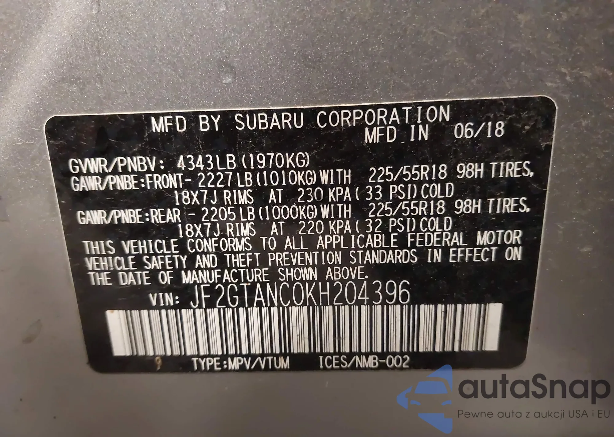 VIN: JF2GTANC0KH204396