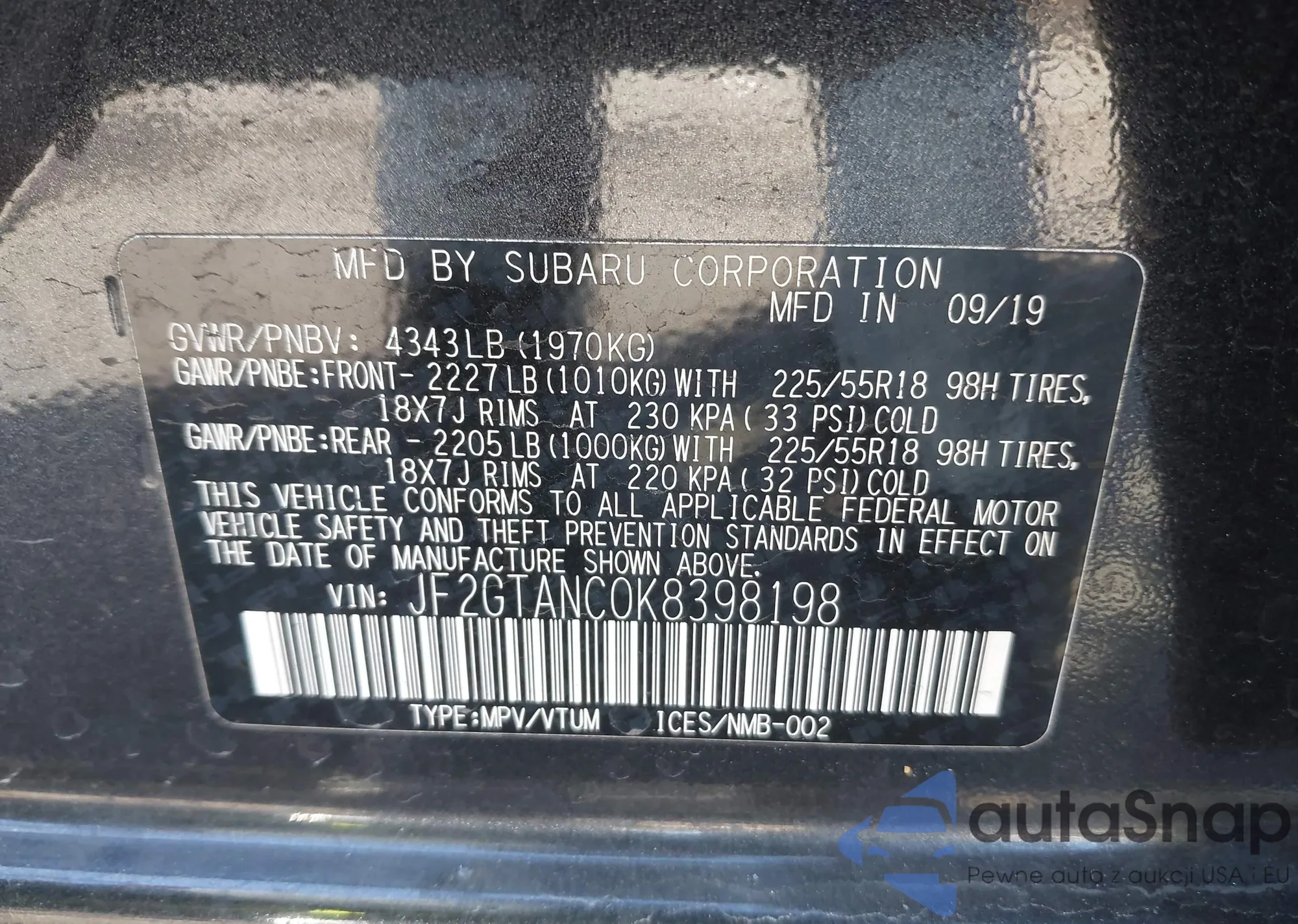 • VIN: JF2GTANC0K8398198
