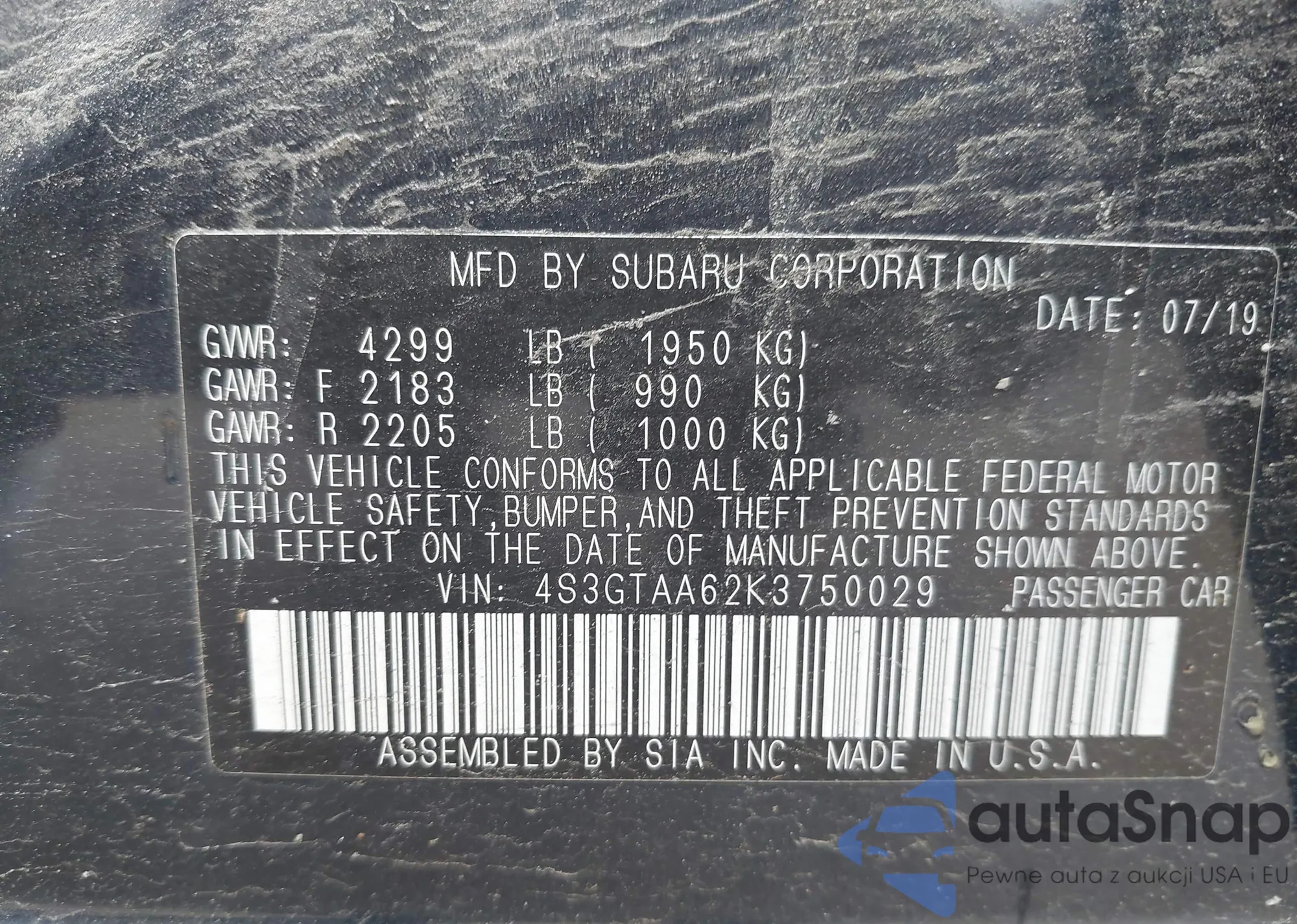 • VIN: 4S3GTAA62K3750029