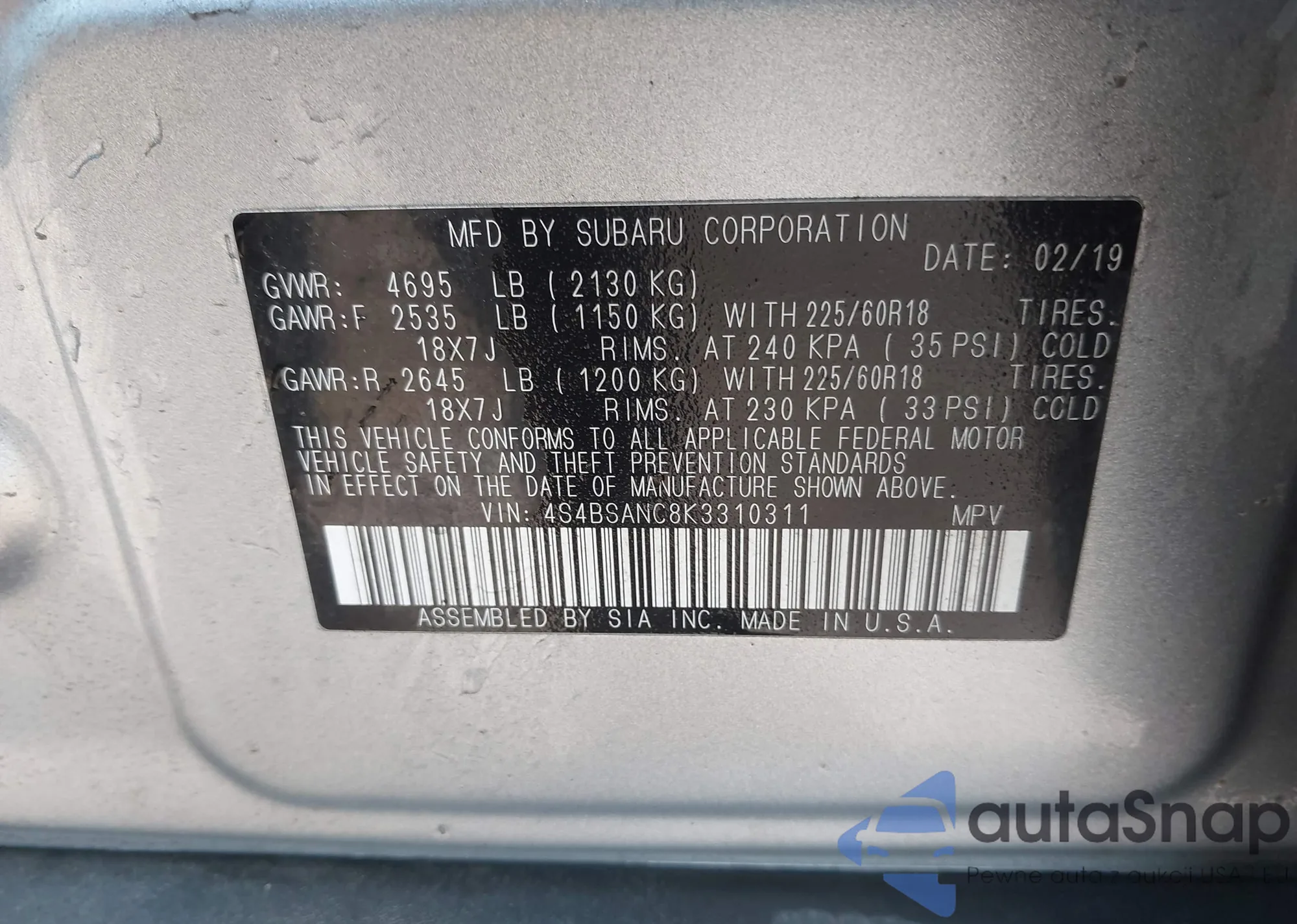 Samochód Subaru Outback 2019 (VIN 4S4BSANC8K3310311) nie był wcześniej licytowany. Dokumenty są czyste, przebieg odpowiada lub jest niższy niż średnia rynku. Sprzedaje go firma ubezpieczeniowa – polecamy zakup. Dostawa do portu zajmie ok. 6–8 tygodni.