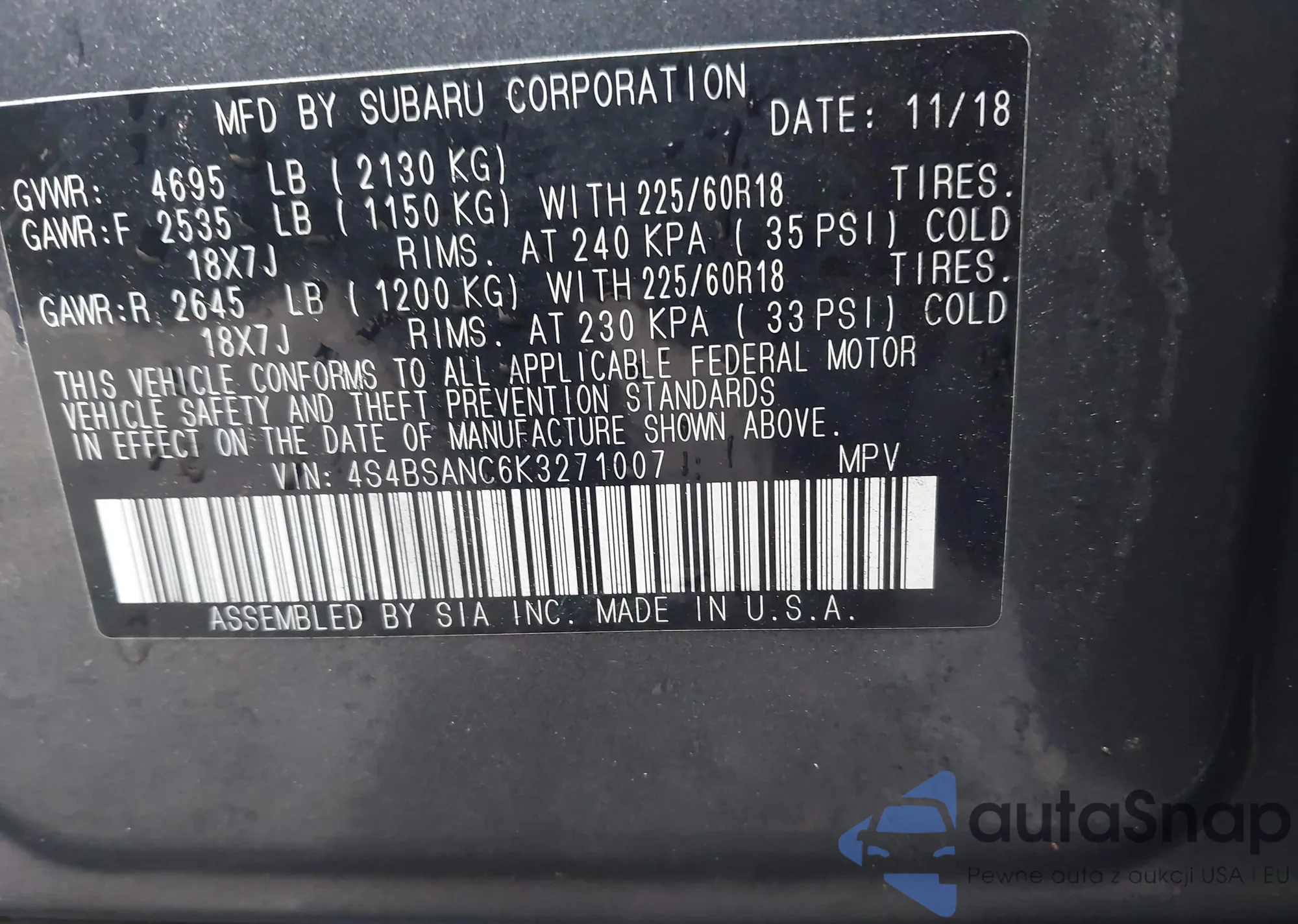 • VIN: 4S4BSANC6K3271007