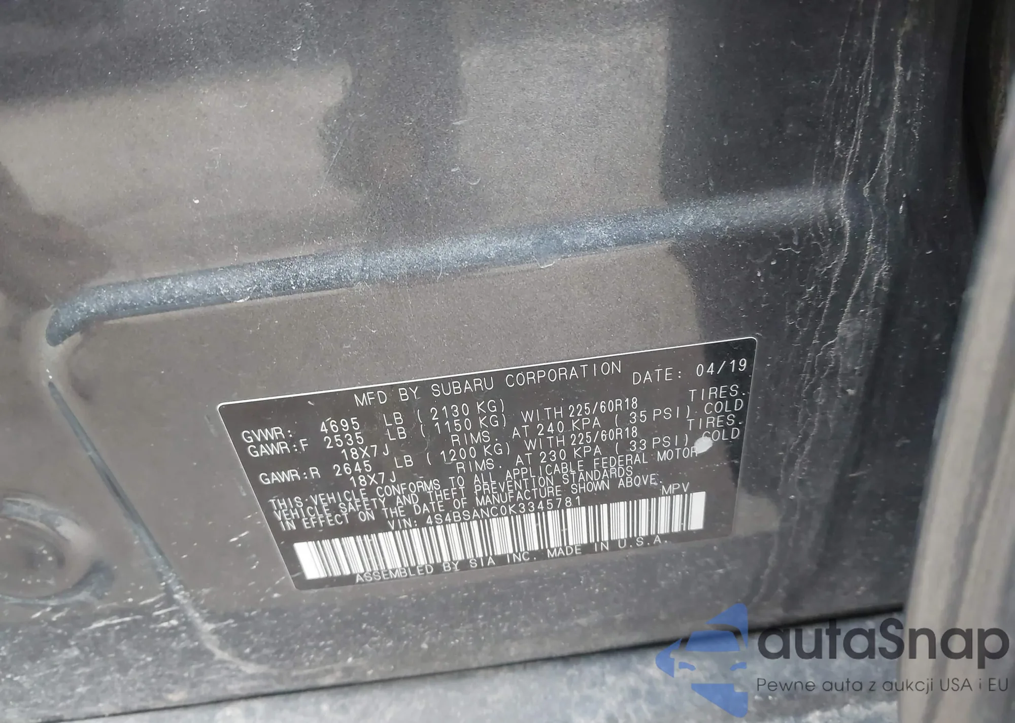 Samochód Subaru Outback 2019 (VIN 4S4BSANC0K3345781) nie był wcześniej licytowany. Dokumenty są czyste, przebieg odpowiada lub jest niższy niż średnia rynku. Sprzedaje go firma ubezpieczeniowa – polecamy zakup. Dostawa do portu zajmie ok. 6–8 tygodni.
