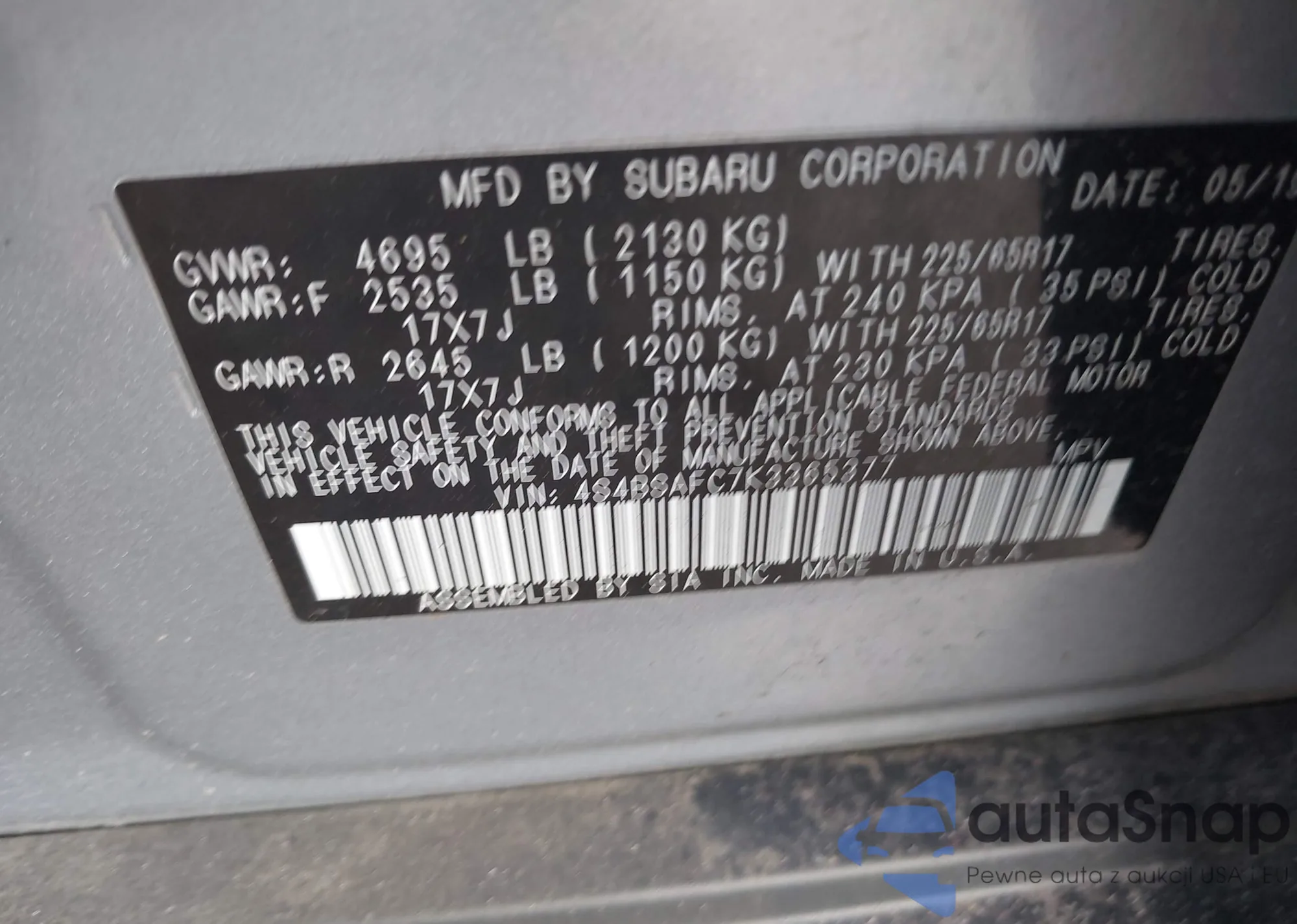 VIN: 4S4BSAFC7K3365377