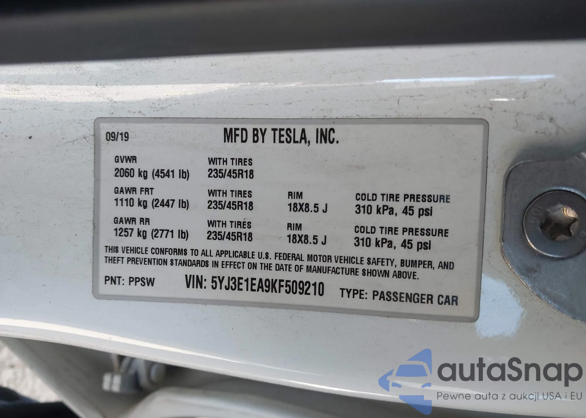 Samochód Tesla Model 3 2019 (VIN 5YJ3E1EA9KF509210) nie był wcześniej licytowany. Dokumenty są czyste, przebieg odpowiada lub jest niższy niż średnia rynku. Sprzedaje go firma ubezpieczeniowa – polecamy zakup. Dostawa do portu zajmie ok. 6–8 tygodni.