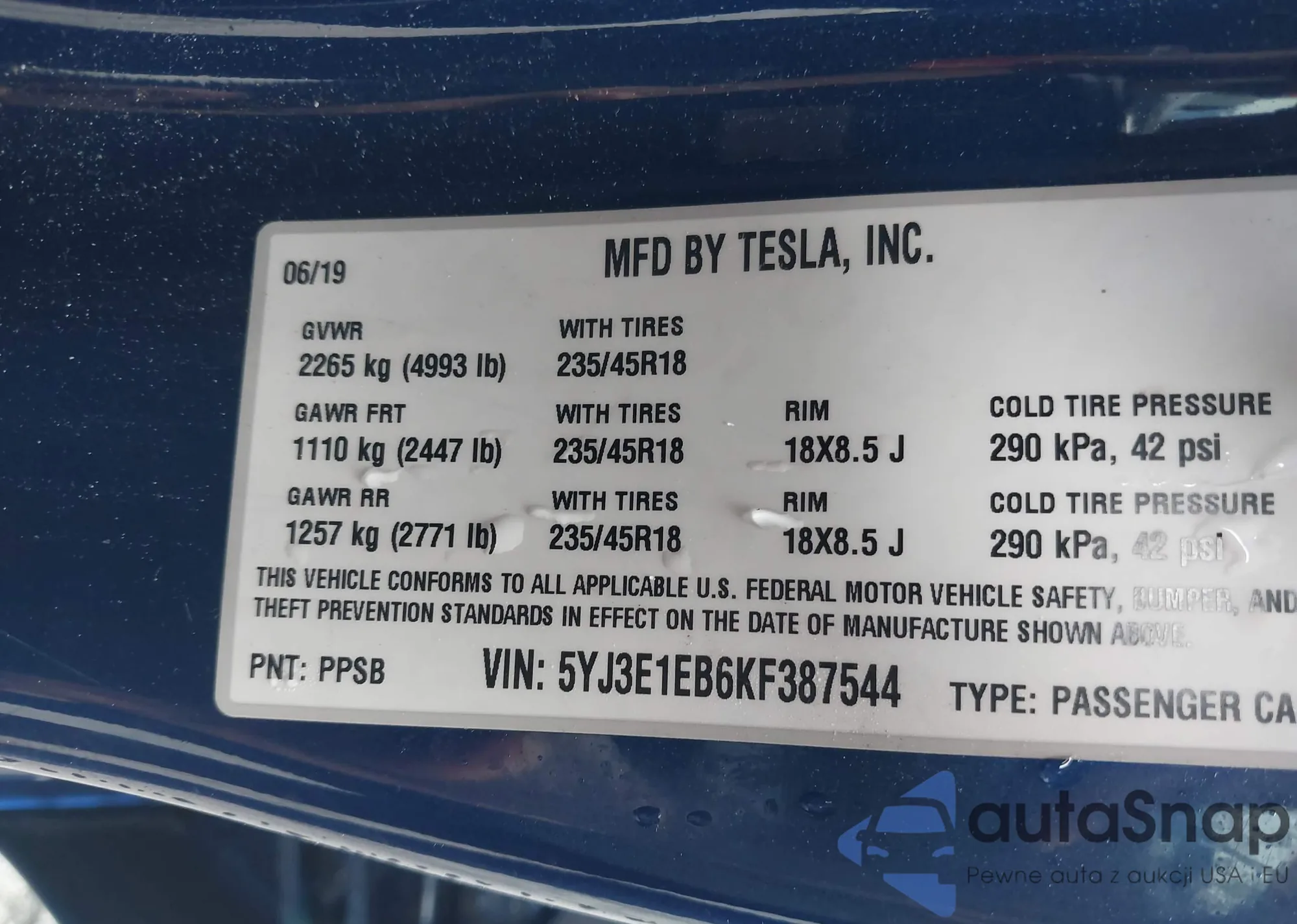 Samochód Tesla Model 3 2019 (VIN 5YJ3E1EB6KF387544) nie był wcześniej licytowany. Dokumenty są czyste, przebieg odpowiada lub jest niższy niż średnia rynku. Sprzedaje go firma ubezpieczeniowa – polecamy zakup. Dostawa do portu zajmie ok. 6–8 tygodni.