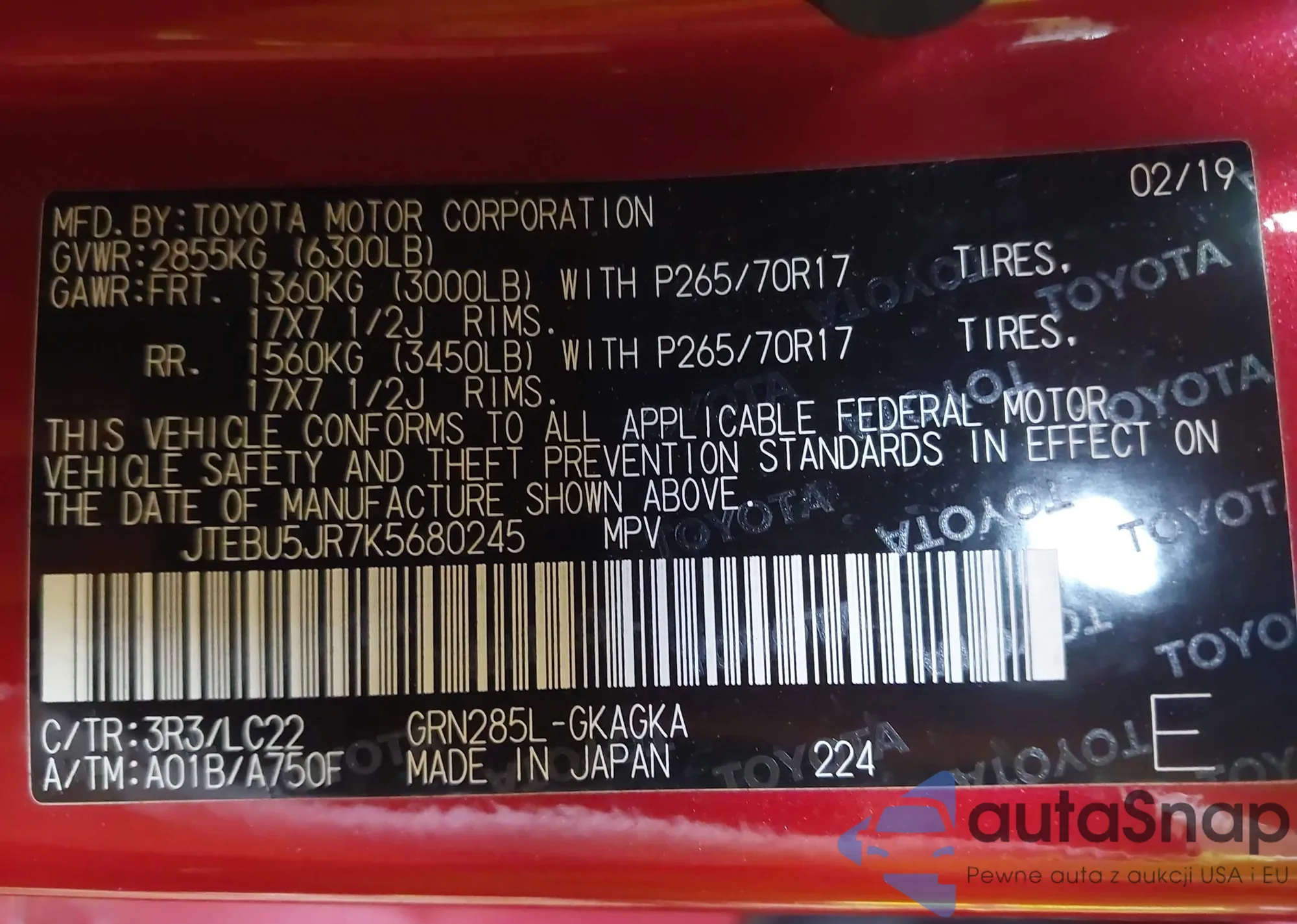 VIN: JTEBU5JR7K5680245