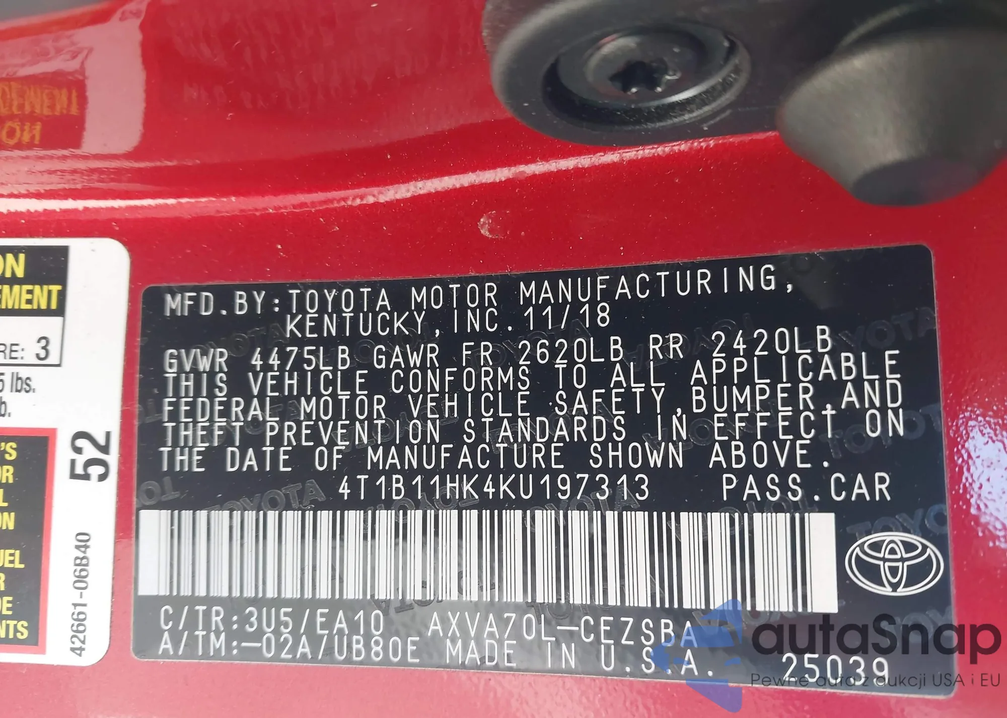 Samochód Toyota Camry 2019 (VIN 4T1B11HK4KU197313) nie był wcześniej licytowany. Dokumenty są czyste, przebieg odpowiada lub jest niższy niż średnia rynku. Sprzedaje go firma ubezpieczeniowa – polecamy zakup. Dostawa do portu zajmie ok. 6–8 tygodni.