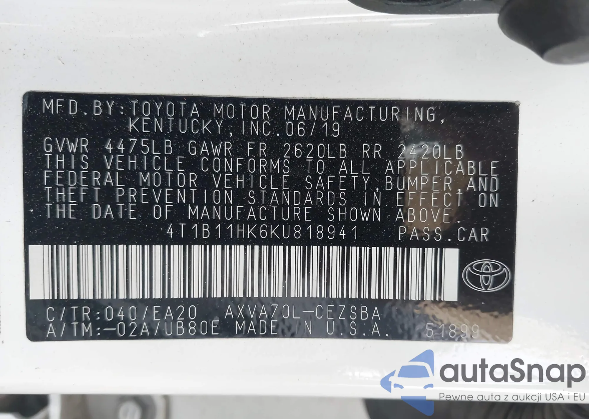 VIN: 4T1B11HK6KU818941
