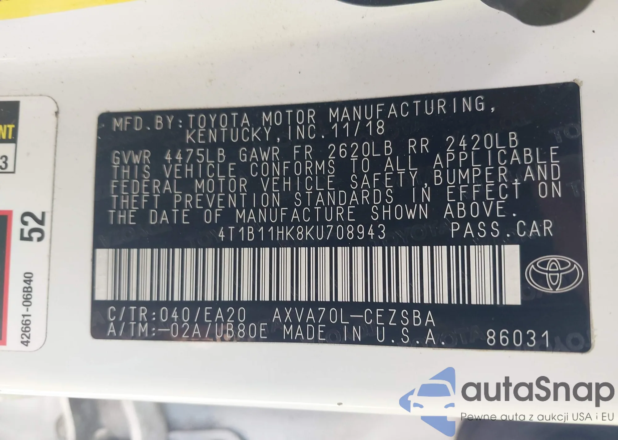 VIN: 4T1B11HK8KU708943