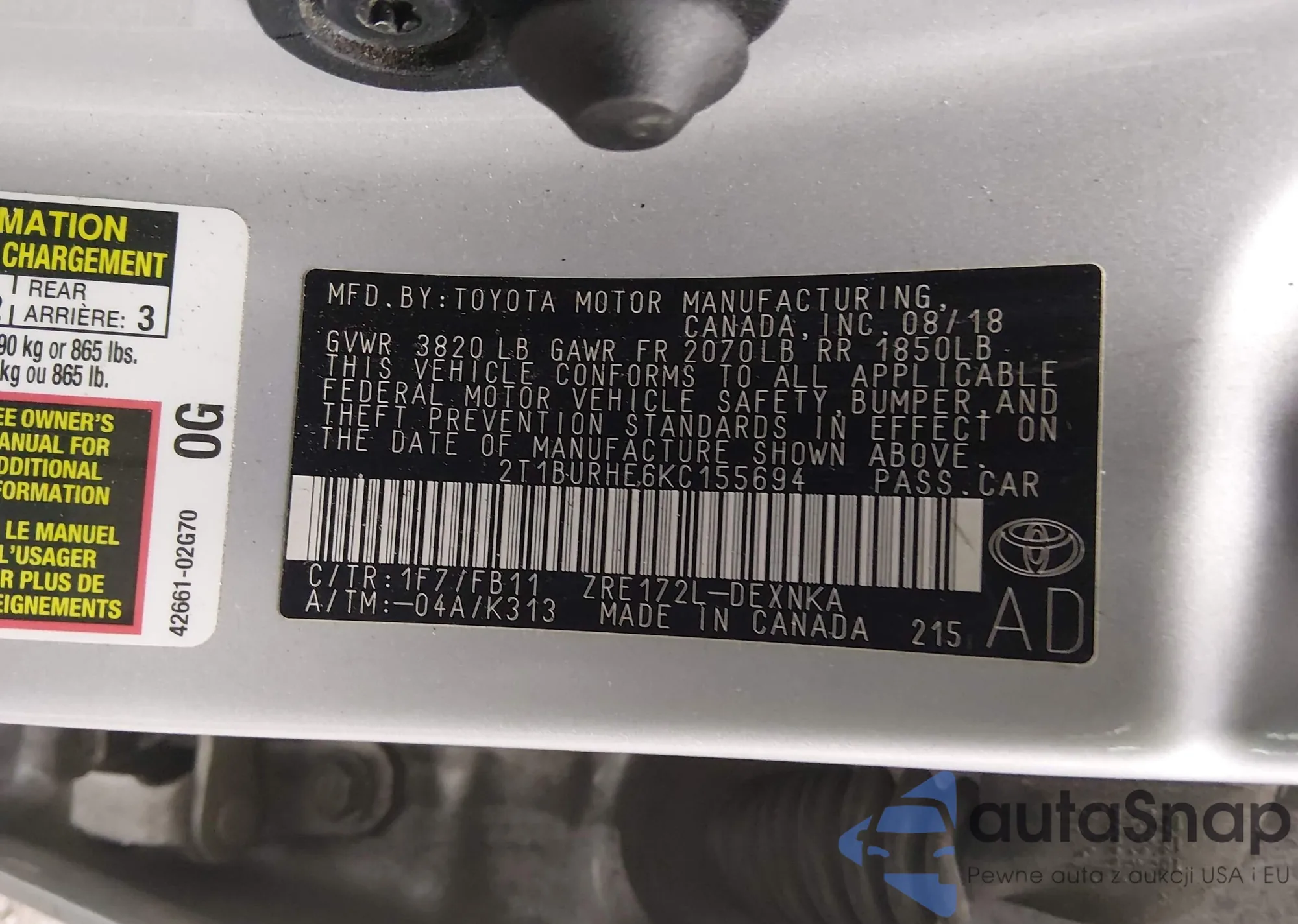 Samochód Toyota Corolla 2019 (VIN 2T1BURHE6KC155694) nie był wcześniej licytowany. Dokumenty są czyste, przebieg odpowiada lub jest niższy niż średnia rynku. Sprzedaje go firma ubezpieczeniowa – polecamy zakup. Dostawa do portu zajmie ok. 6–8 tygodni.