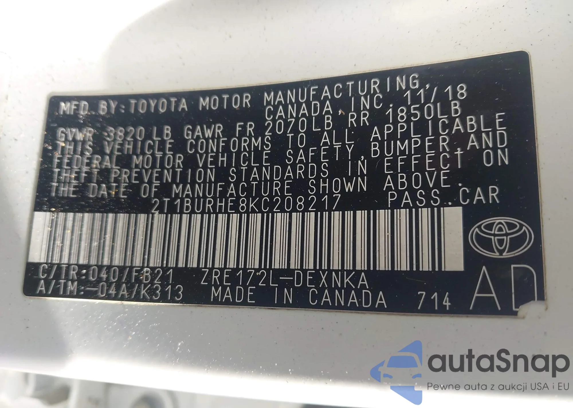 Samochód Toyota Corolla 2019 (VIN 2T1BURHE8KC208217) sprzedaje go niezweryfikowany sprzedawca. Zalecamy raport Carfax i potwierdzenie możliwości rejestracji pojazdu przed zakupem.