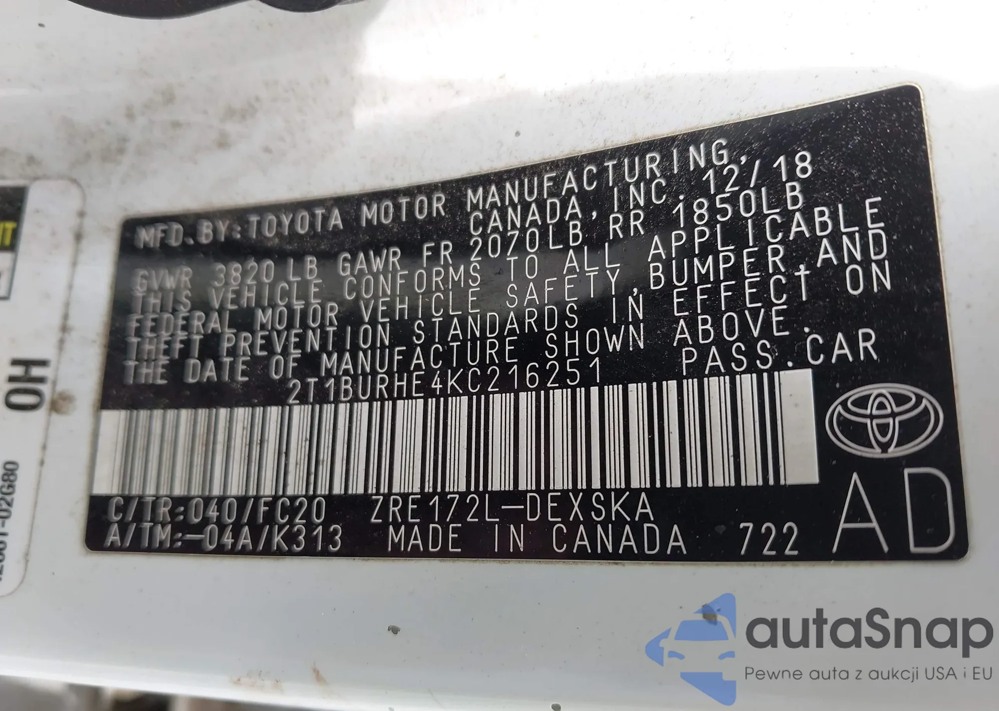 VIN: 2T1BURHE4KC216251