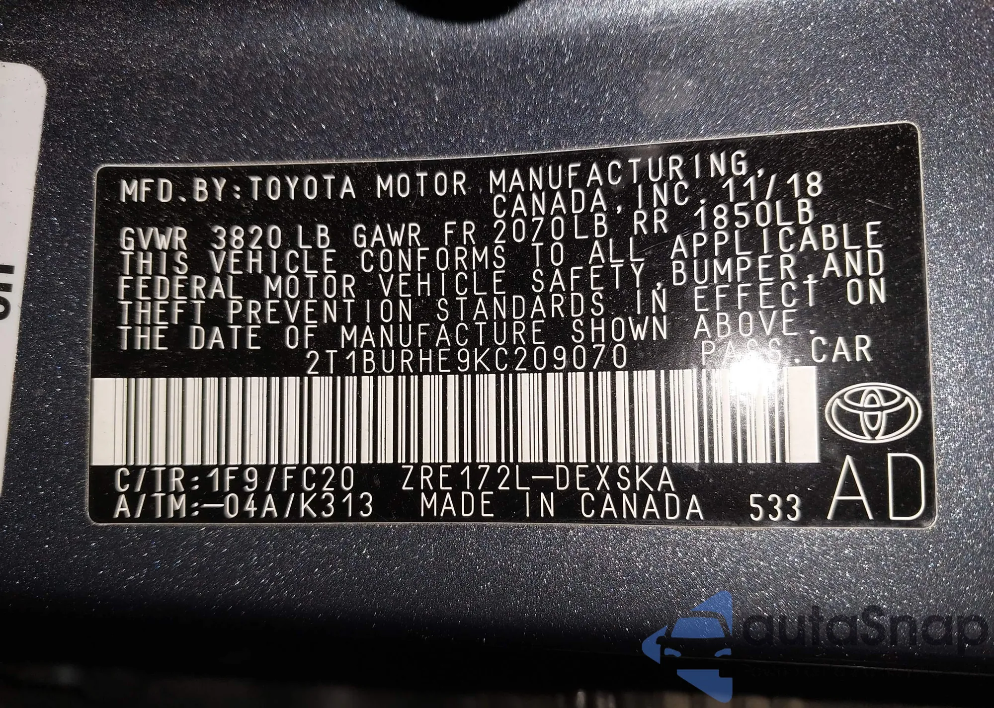 VIN: 2T1BURHE9KC209070