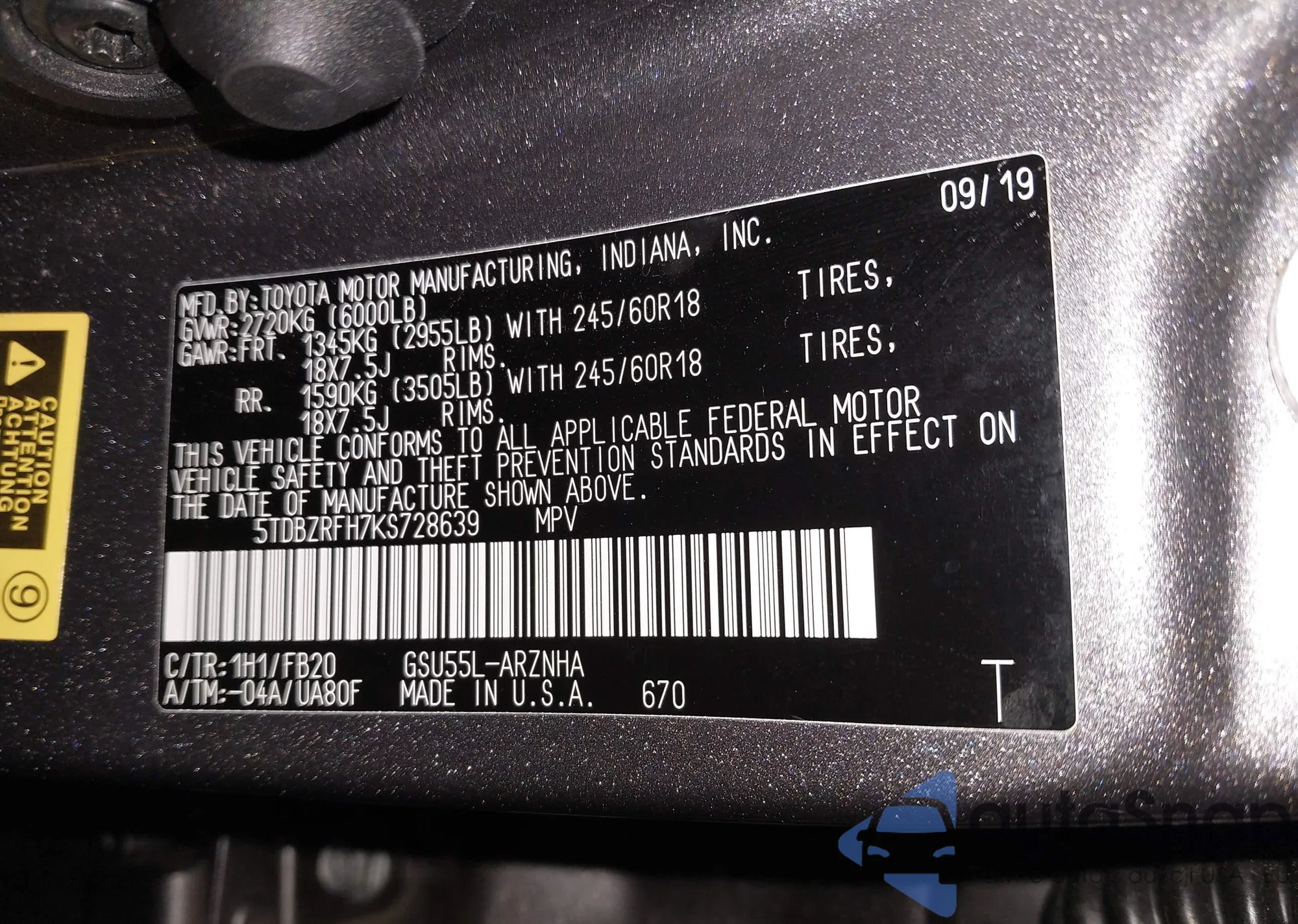 VIN: 5TDBZRFH7KS728639