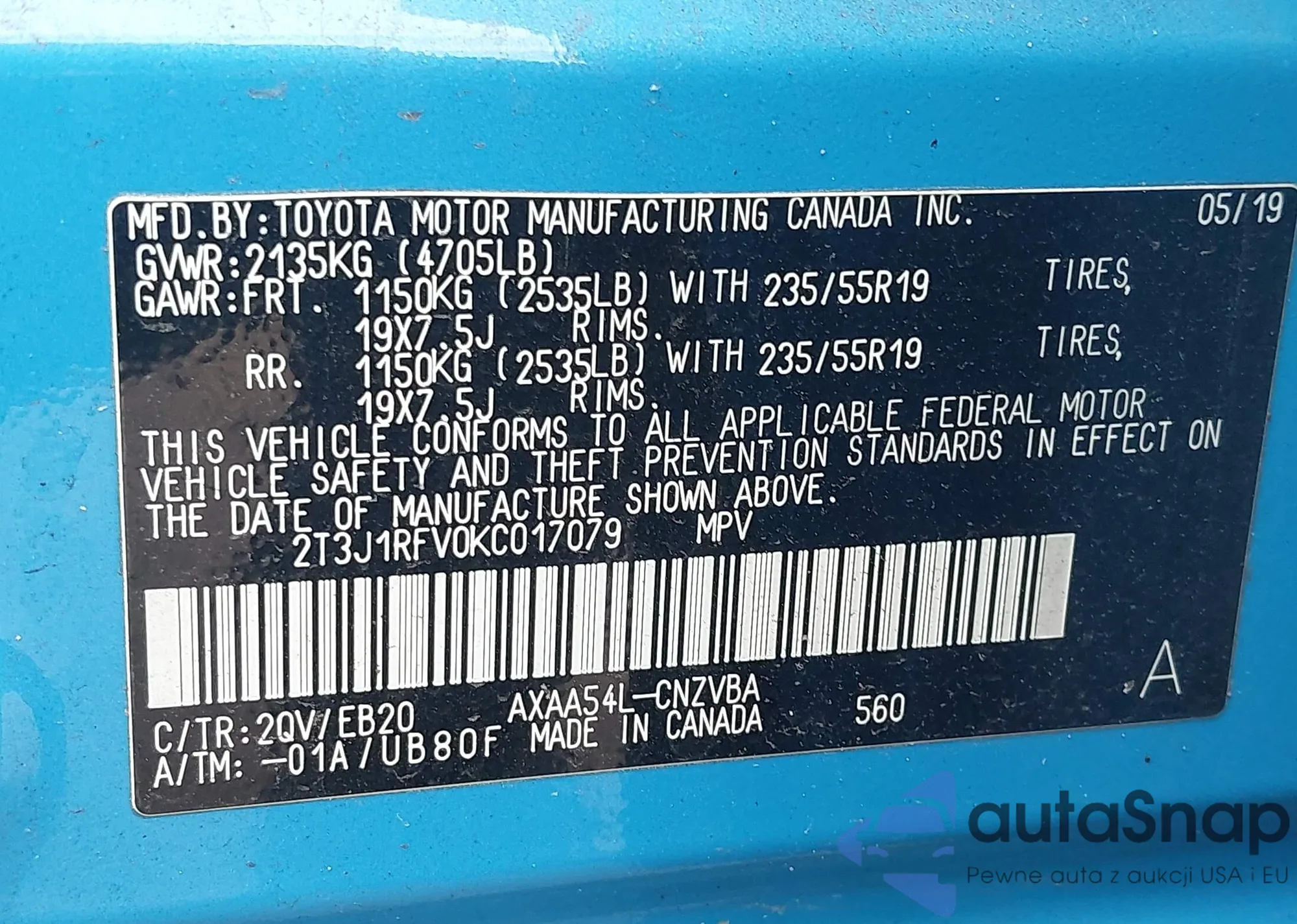 VIN: 2T3J1RFV0KC017079