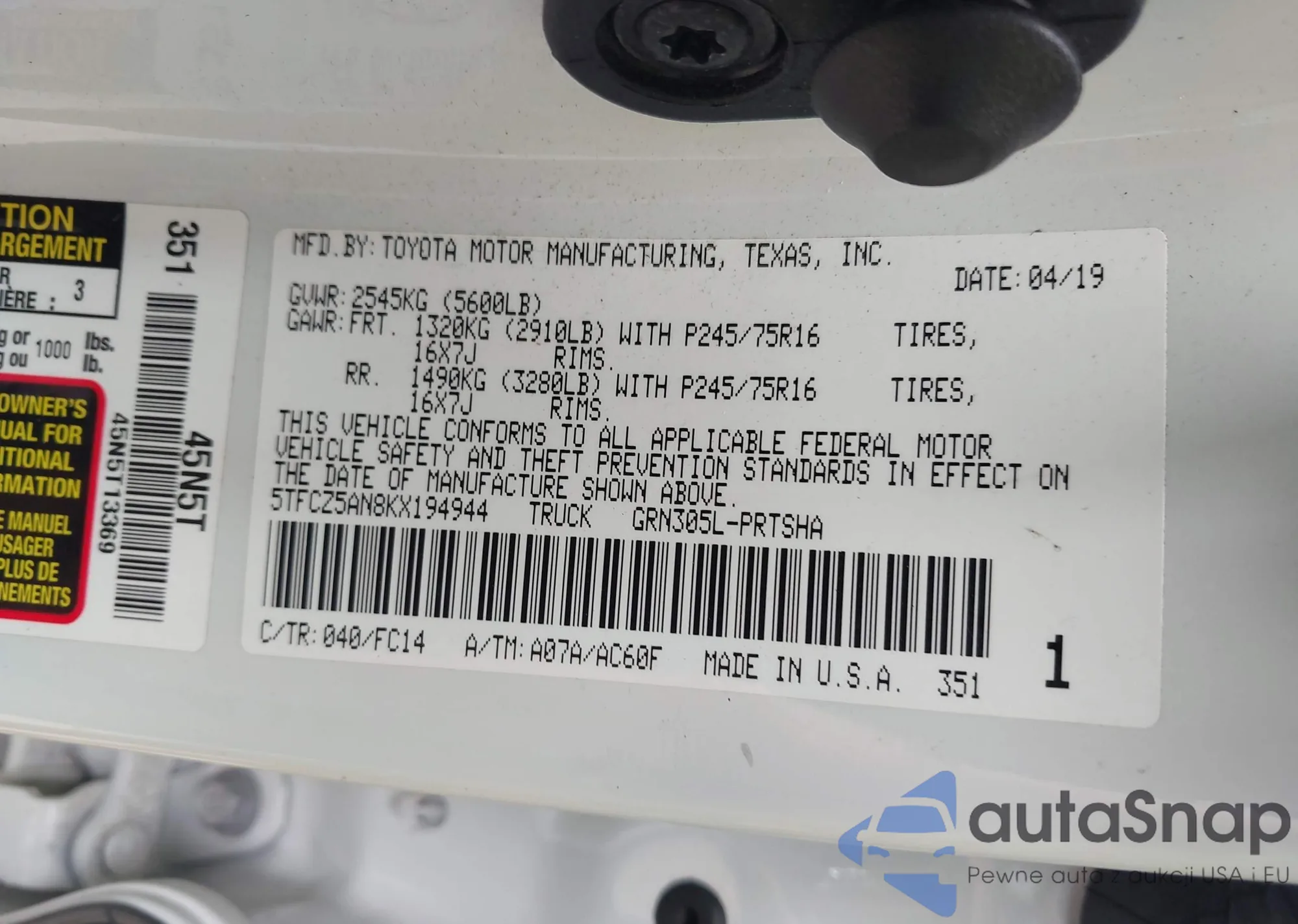 VIN: 5TFCZ5AN8KX194944