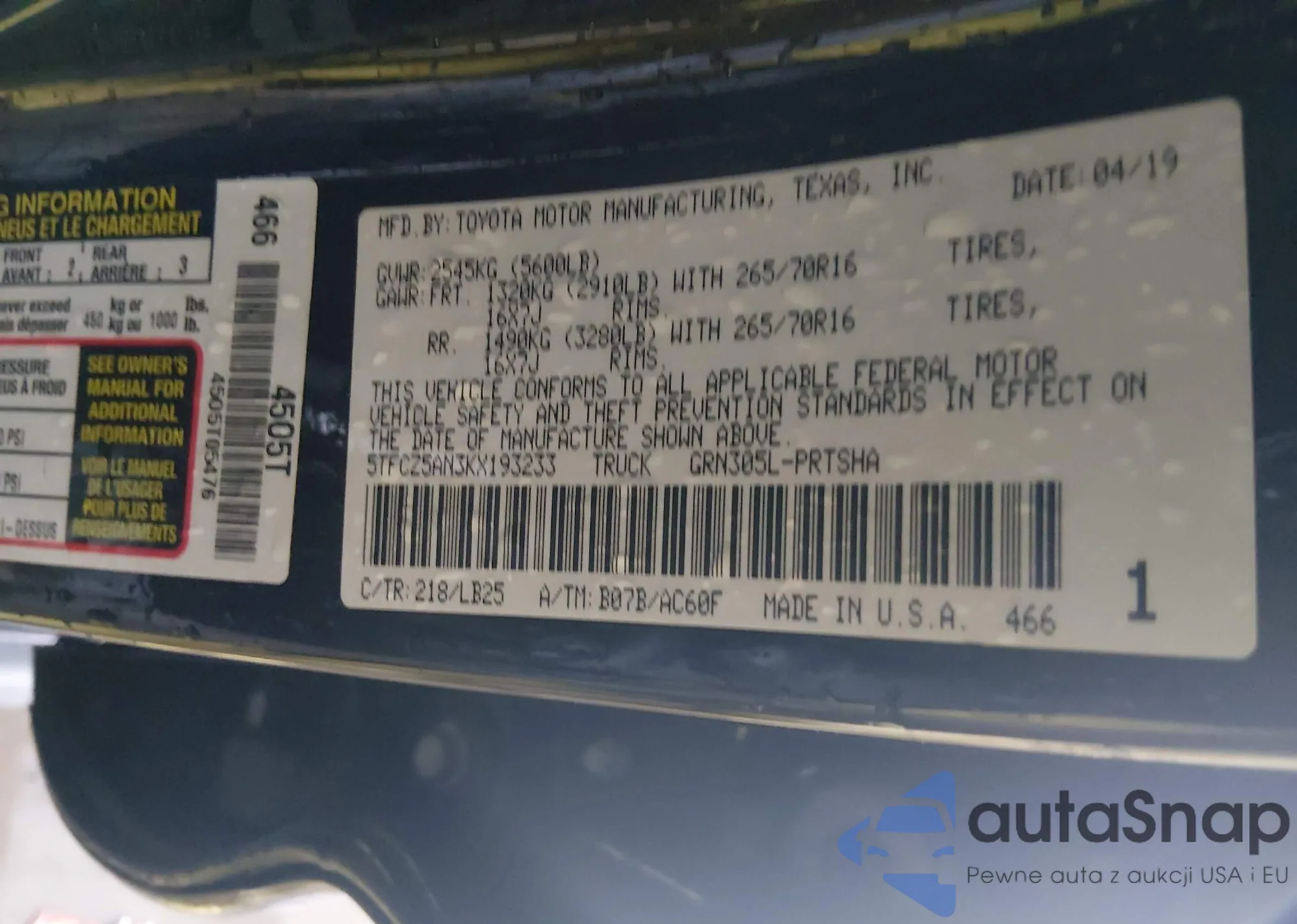 Samochód Toyota Tacoma 2019 (VIN 5TFCZ5AN3KX193233) nie był wcześniej licytowany. Dokumenty są czyste, przebieg odpowiada lub jest niższy niż średnia rynku. Sprzedaje go firma ubezpieczeniowa – polecamy zakup. Dostawa do portu zajmie ok. 6–8 tygodni.