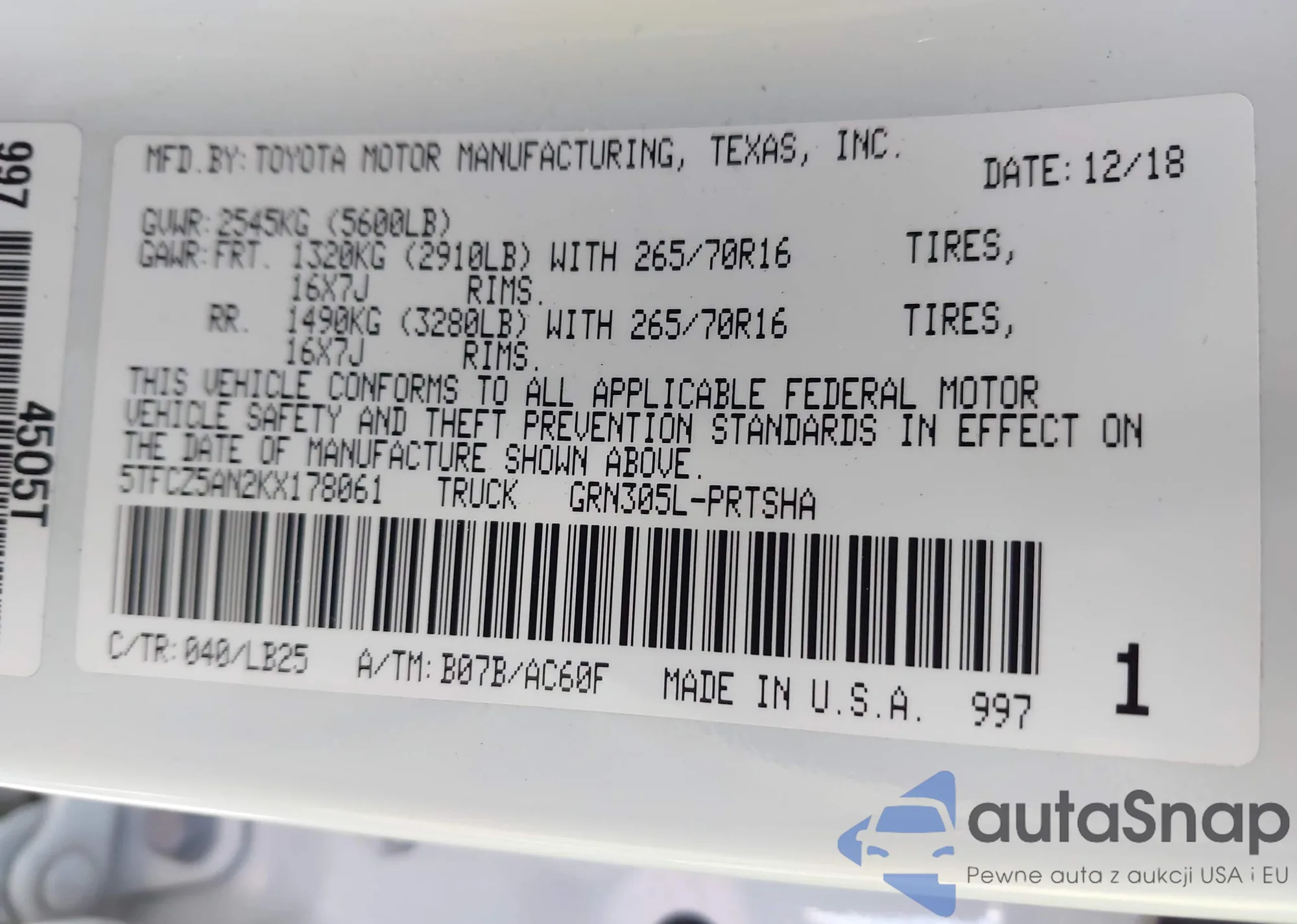 • VIN: 5TFCZ5AN2KX178061