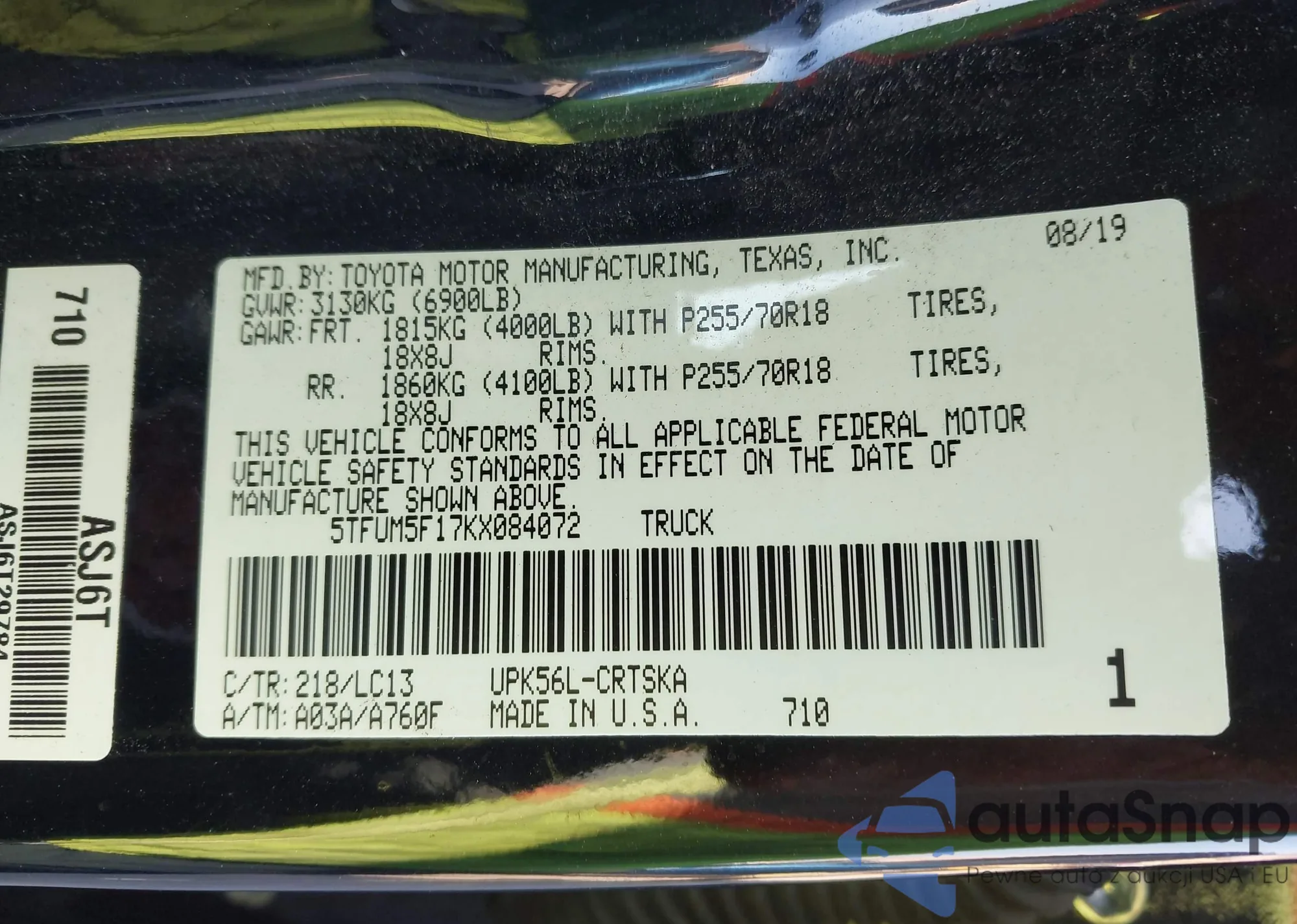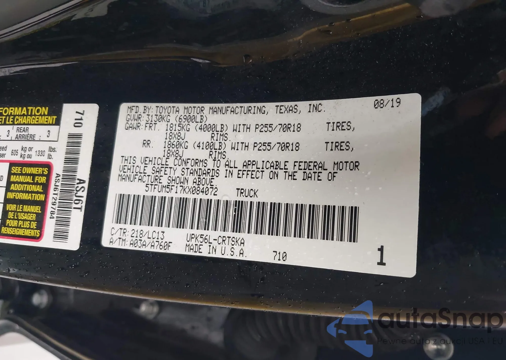 Samochód Toyota Tundra 2019 (VIN 5TFUM5F17KX084072) nie był wcześniej licytowany. Dokumenty są czyste, przebieg odpowiada lub jest niższy niż średnia rynku. Sprzedaje go firma ubezpieczeniowa – polecamy zakup. Dostawa do portu zajmie ok. 6–8 tygodni.