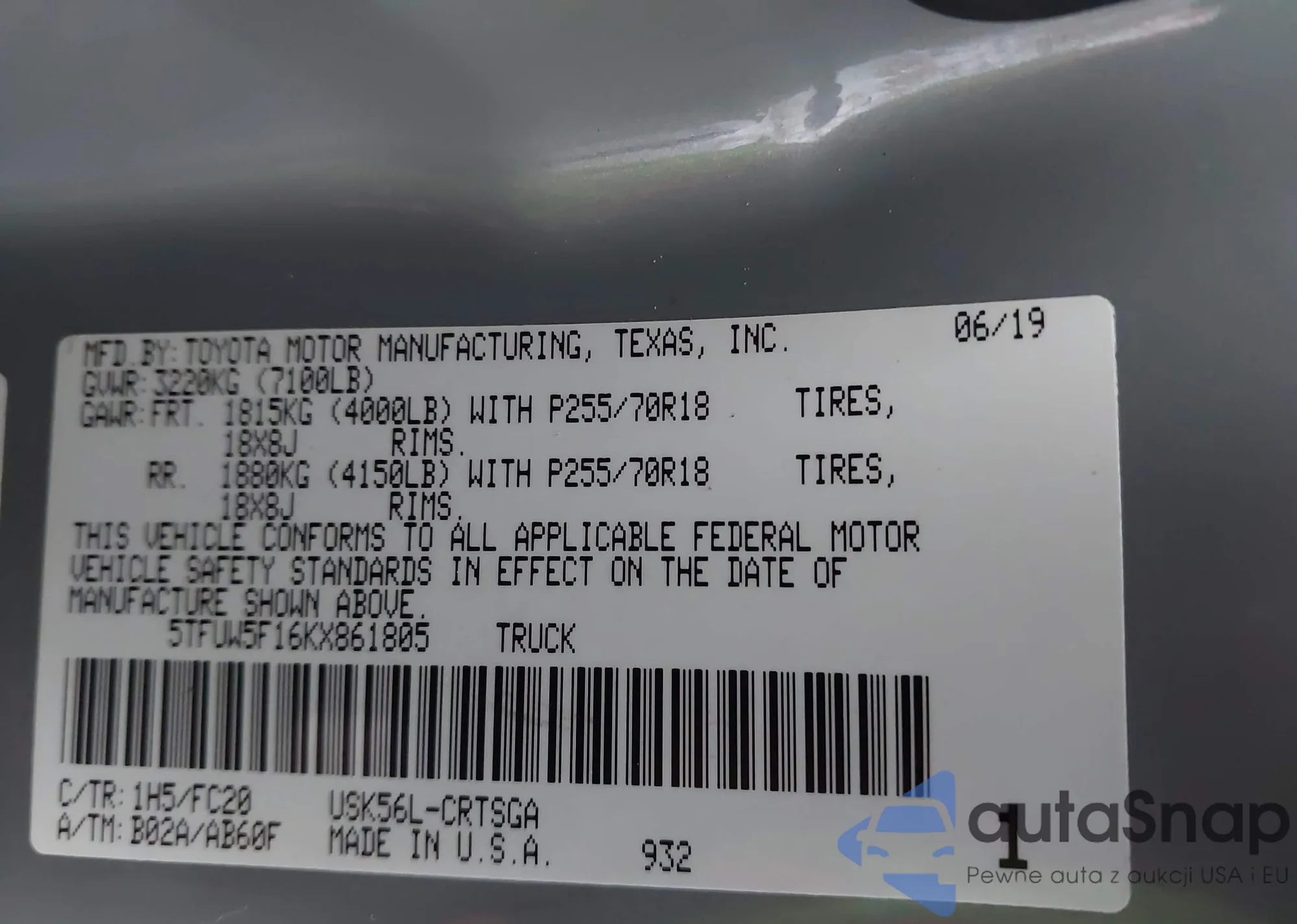 Samochód Toyota Tundra 2019 (VIN 5TFUW5F16KX861805) nie był wcześniej licytowany. Dokumenty są czyste, przebieg odpowiada lub jest niższy niż średnia rynku. Sprzedaje go firma ubezpieczeniowa – polecamy zakup. Dostawa do portu zajmie ok. 6–8 tygodni.