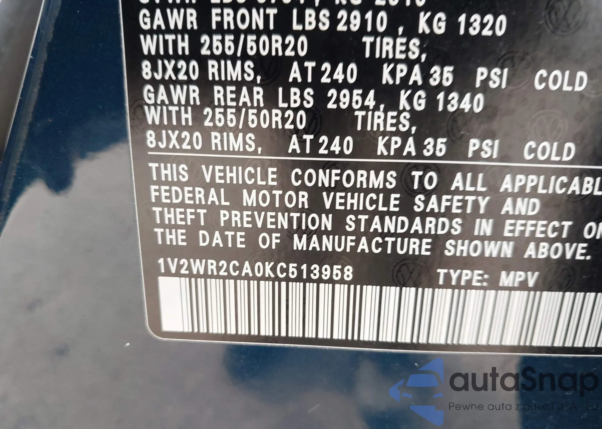 • VIN: 1V2WR2CA0KC513958