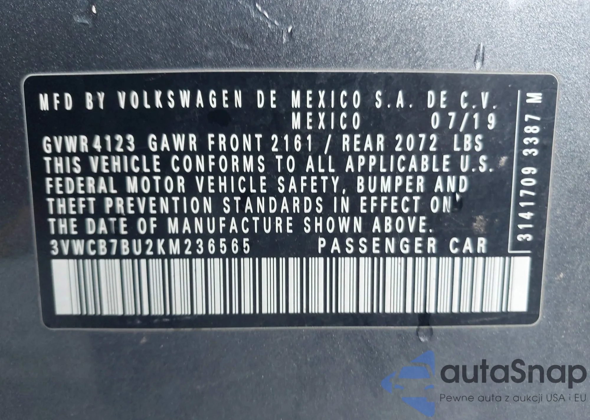 VIN: 3VWCB7BU2KM236565