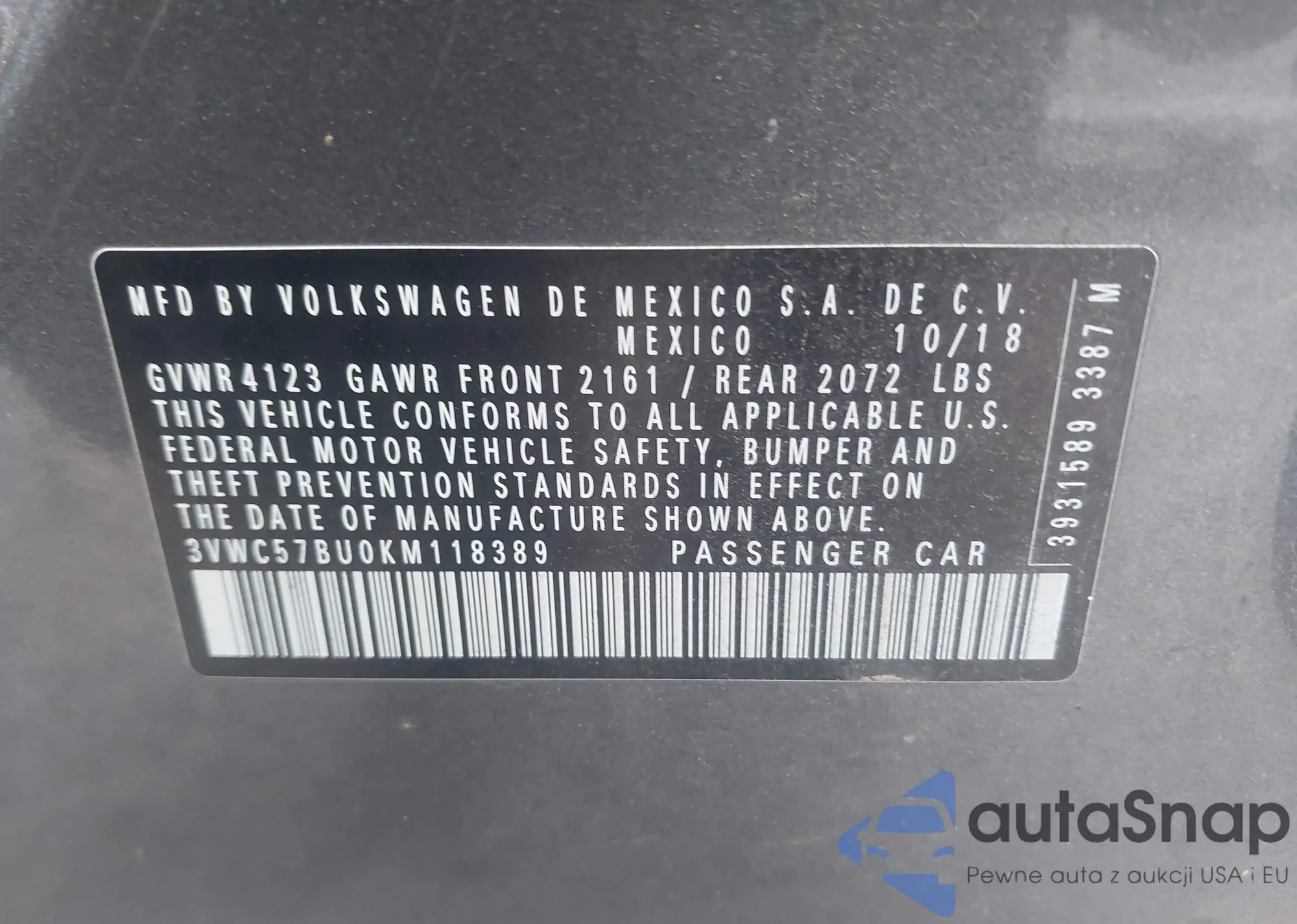 VIN: 3VWC57BU0KM118389
