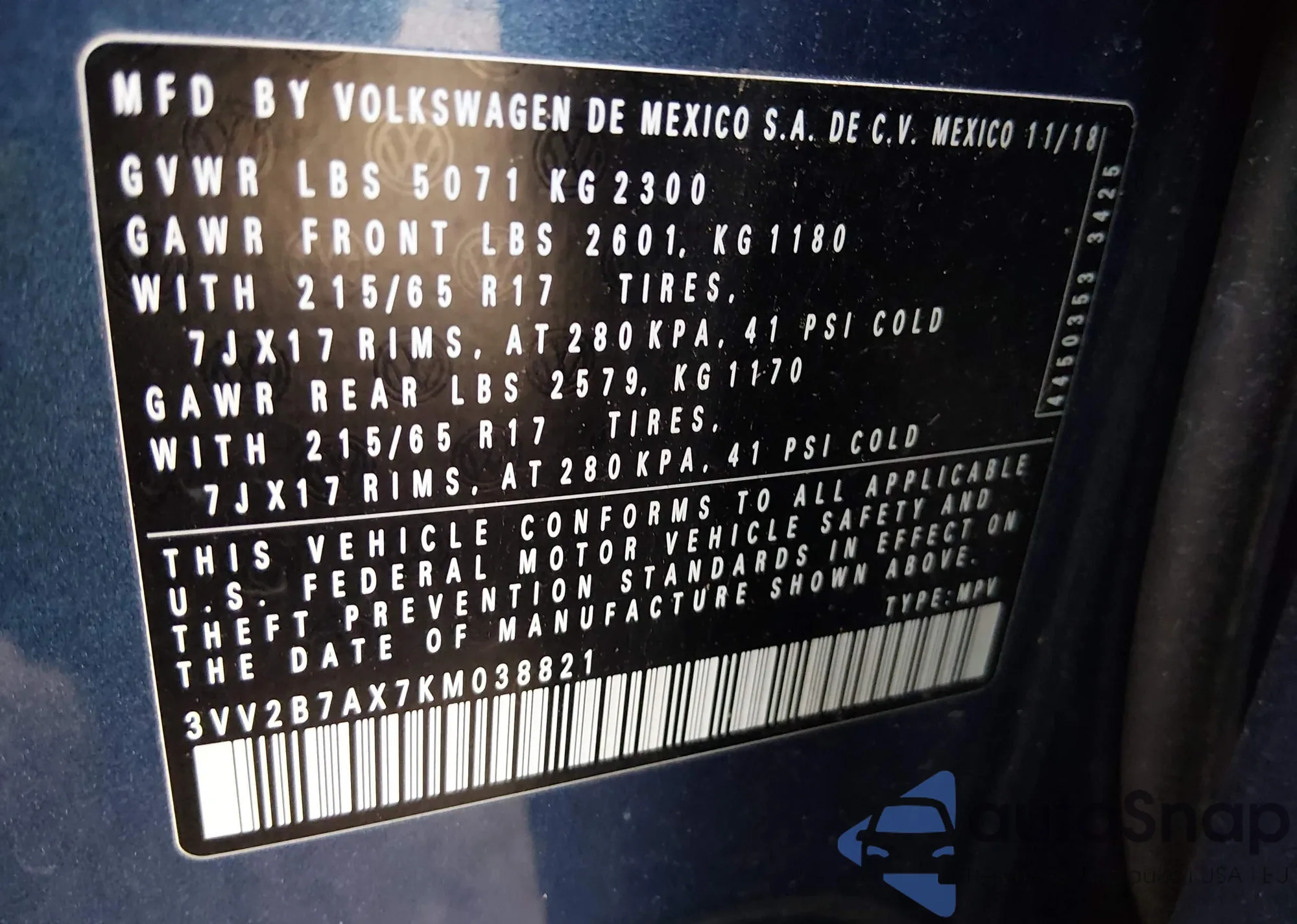 VIN: 3VV2B7AX7KM038821