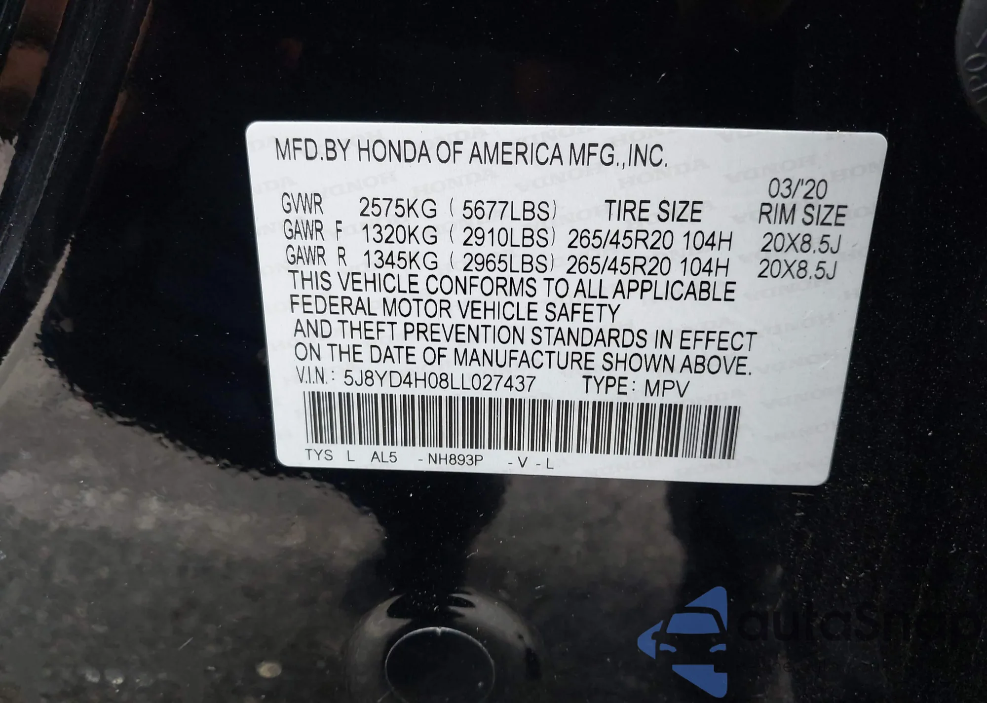 VIN: 5J8YD4H08LL027437