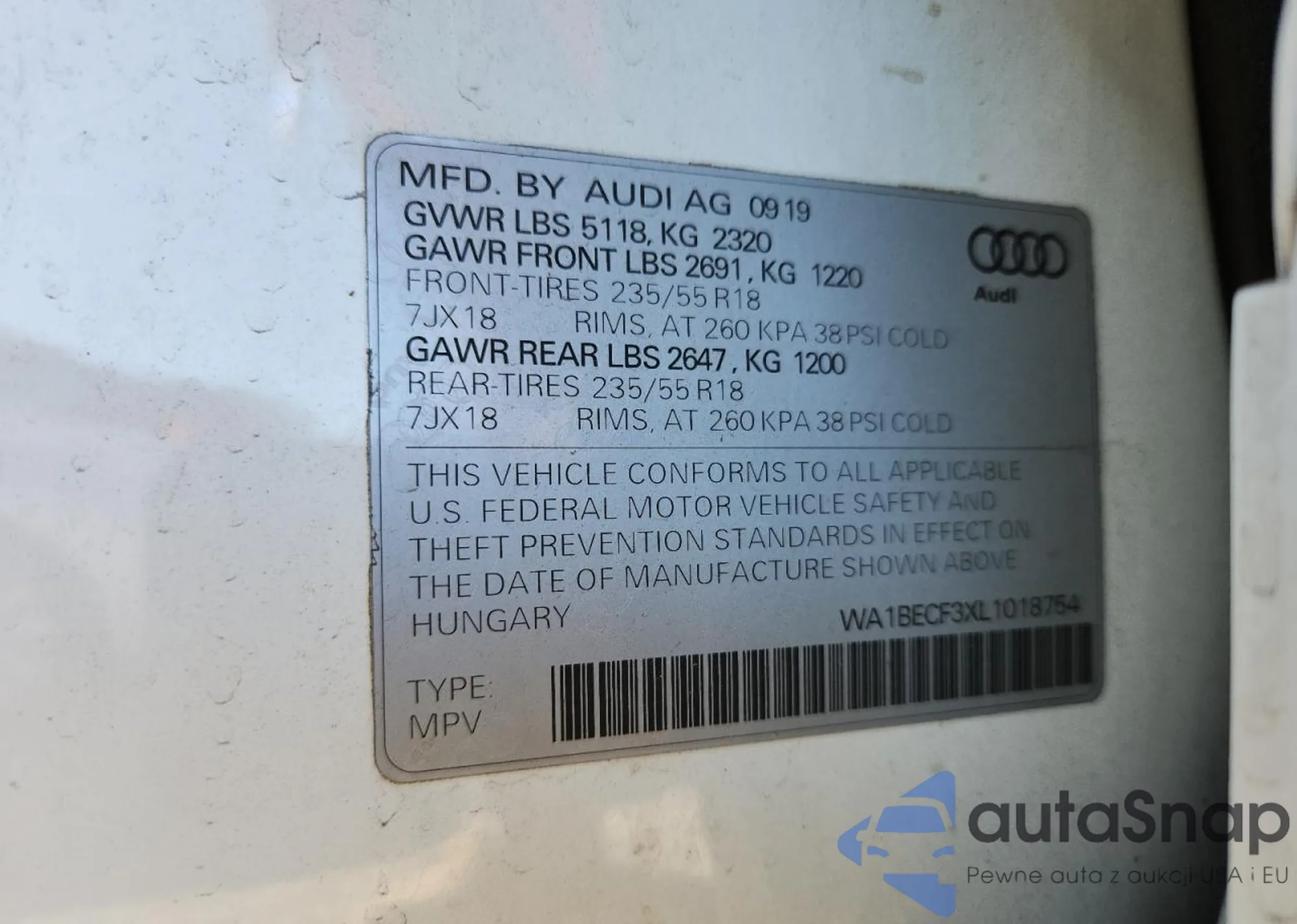 Samochód Audi Q3 2020 (VIN WA1BECF3XL1018754) ma dokumenty uniemożliwiające rejestrację. Mogą pojawić się trudności przy eksporcie i rejestracji. Skontaktuj się z ekspertami AutaSnap w celu znalezienia alternatywy.