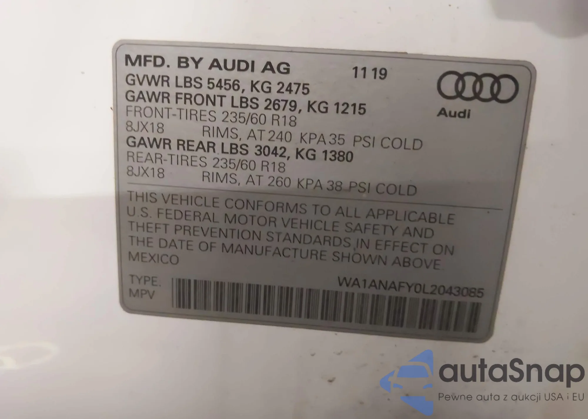 • VIN: WA1ANAFY0L2043085