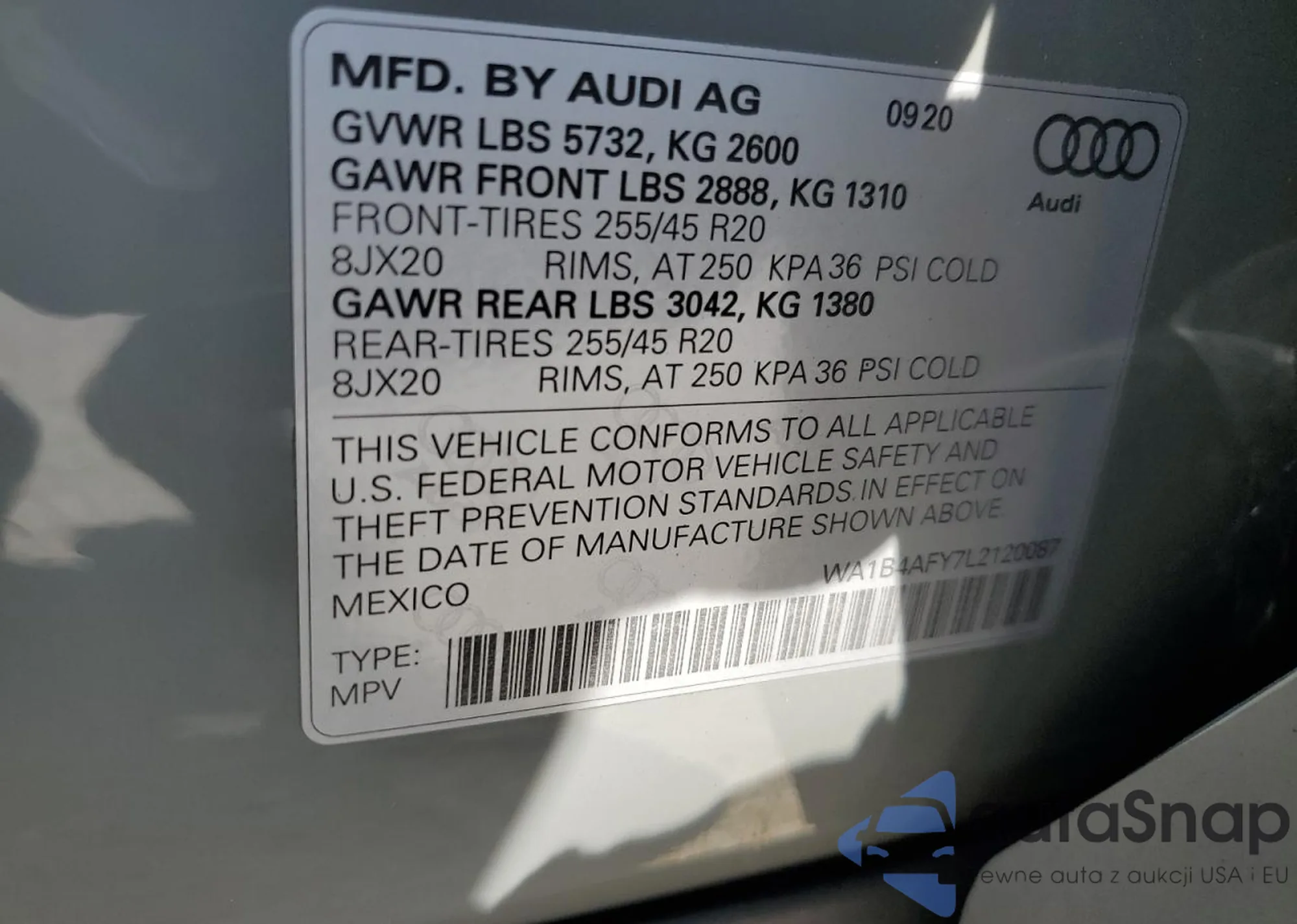 Samochód Audi SQ5 2020 (VIN WA1B4AFY7L2120087) ma dokumenty uniemożliwiające rejestrację. Mogą pojawić się trudności przy eksporcie i rejestracji. Skontaktuj się z ekspertami AutaSnap w celu znalezienia alternatywy.