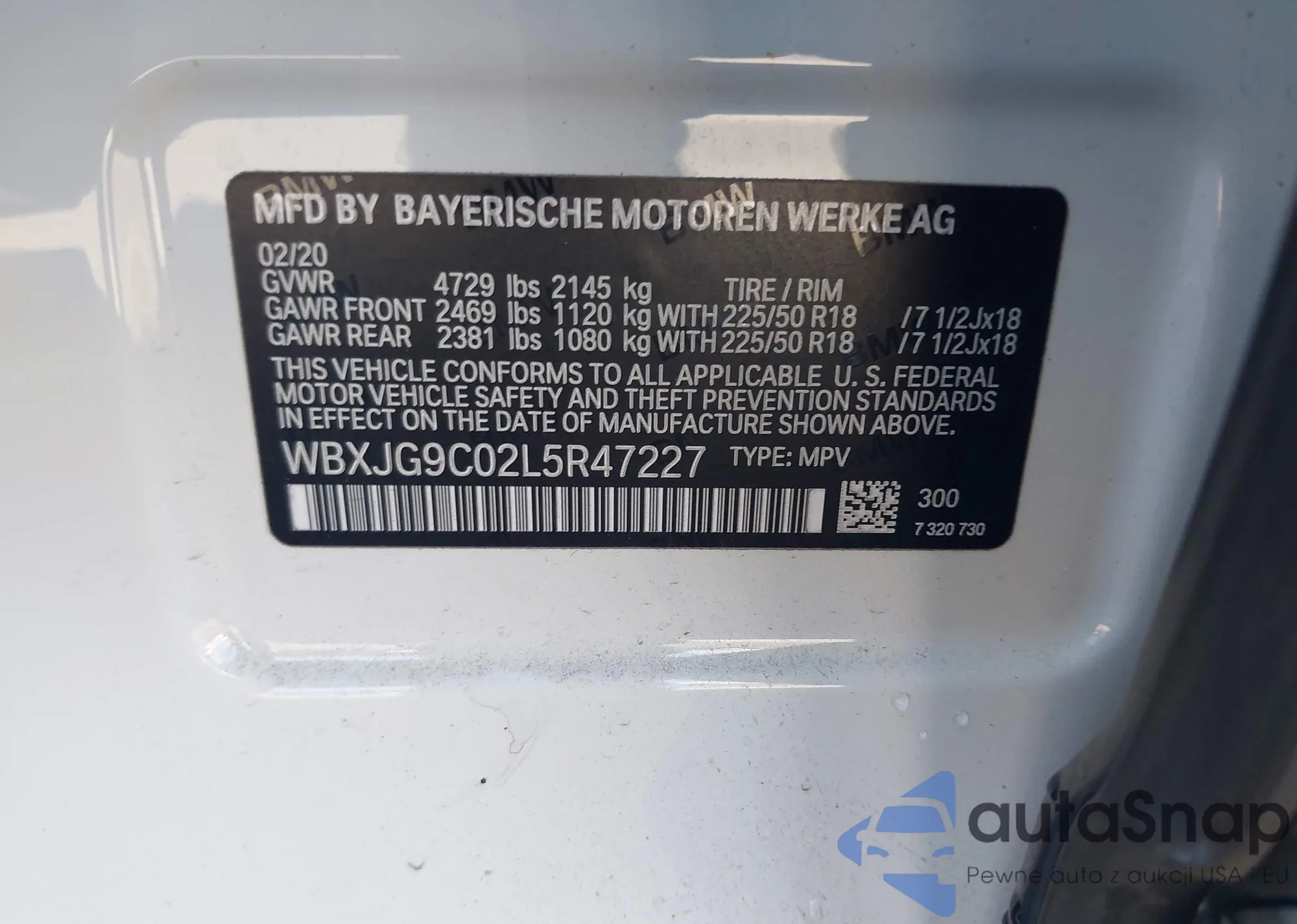 Samochód BMW X1 2020 (VIN WBXJG9C02L5R47227) nie był wcześniej licytowany. Dokumenty są czyste, przebieg odpowiada lub jest niższy niż średnia rynku. Sprzedaje go firma ubezpieczeniowa – polecamy zakup. Dostawa do portu zajmie ok. 6–8 tygodni.