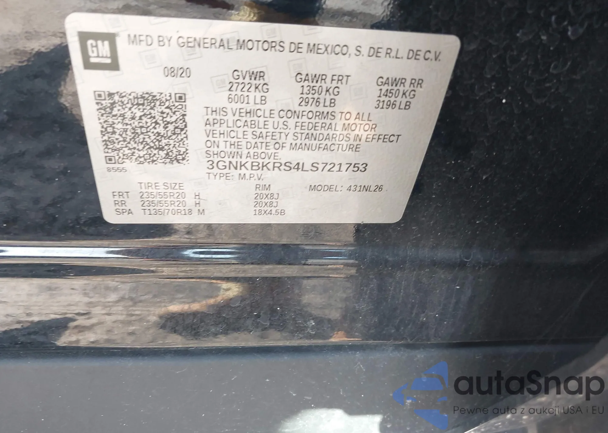 • VIN: 3GNKBKRS4LS721753