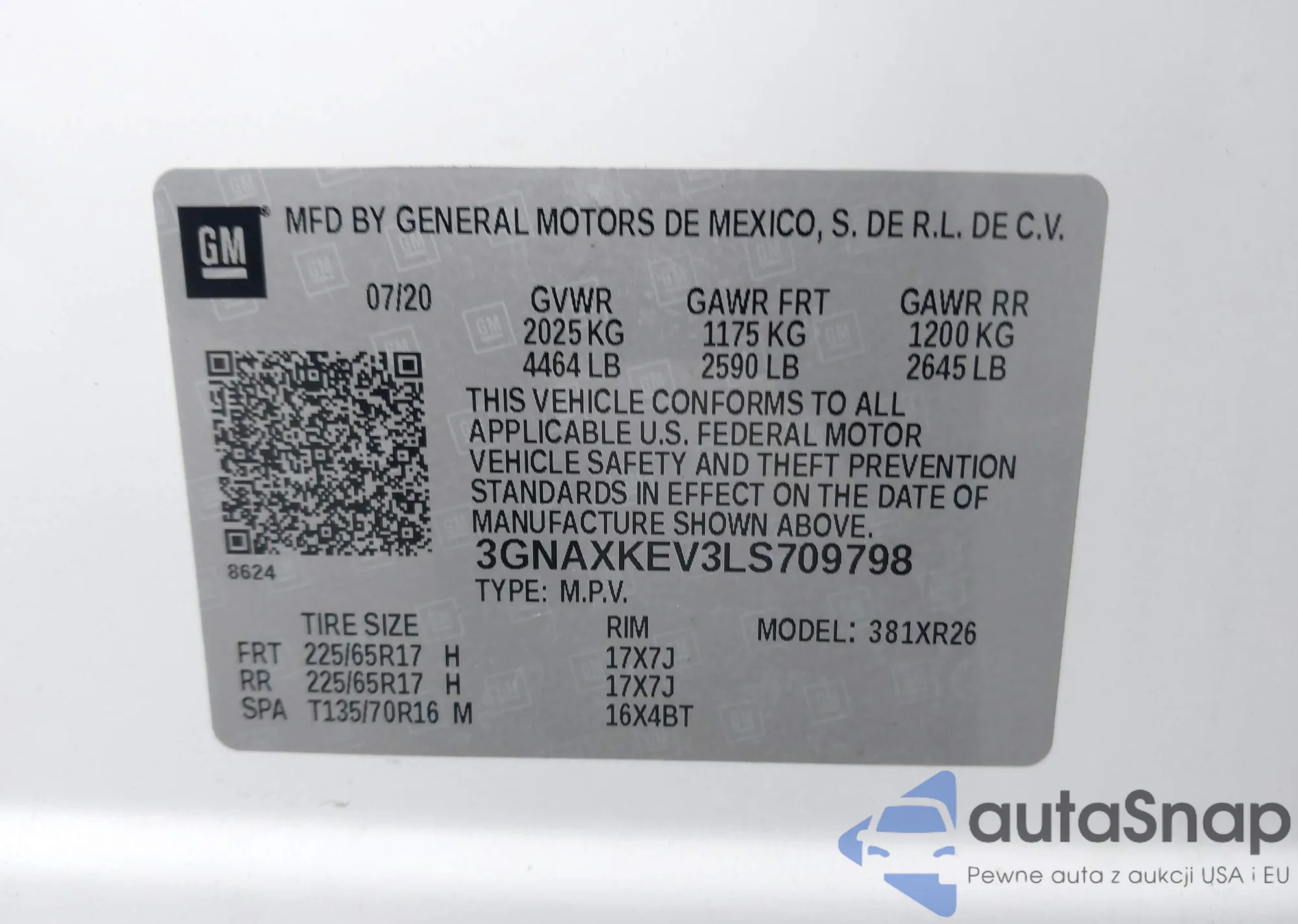 Samochód Chevrolet Equinox 2020 (VIN 3GNAXKEV3LS709798) ma dokumenty uniemożliwiające rejestrację. Mogą pojawić się trudności przy eksporcie i rejestracji. Skontaktuj się z ekspertami AutaSnap w celu znalezienia alternatywy.