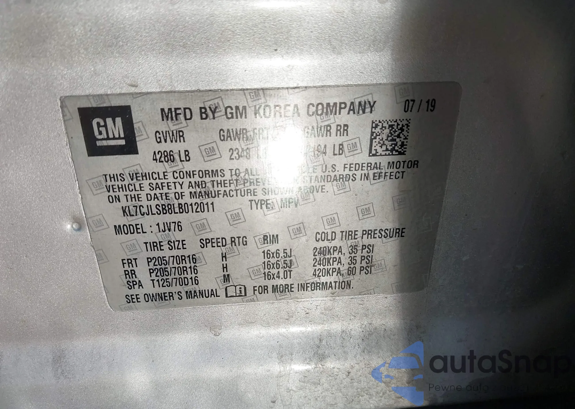 VIN: KL7CJLSB8LB012011