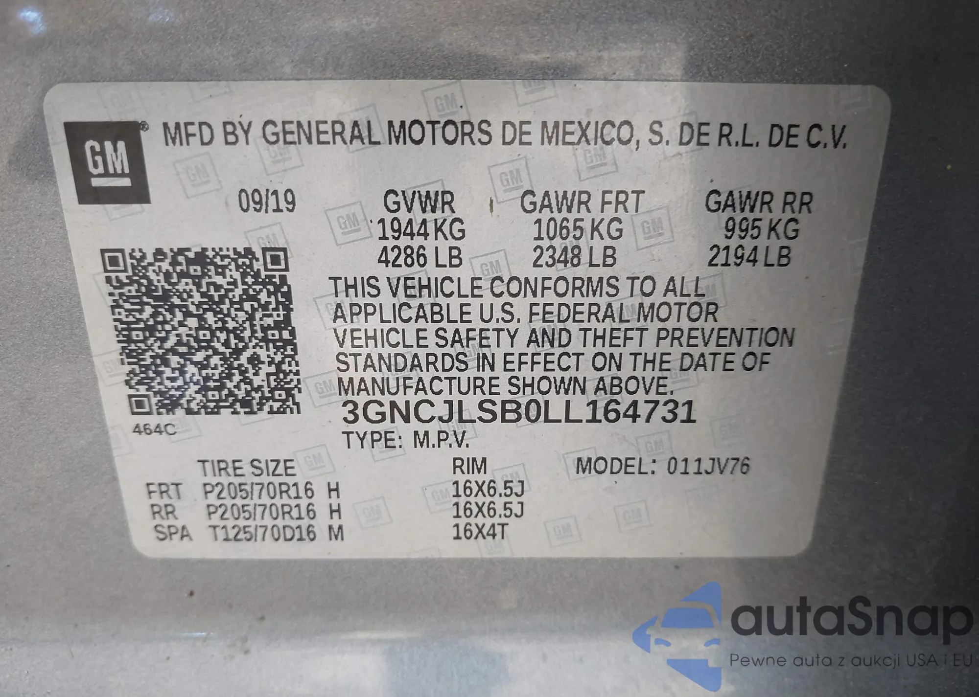 • VIN: 3GNCJLSB0LL164731