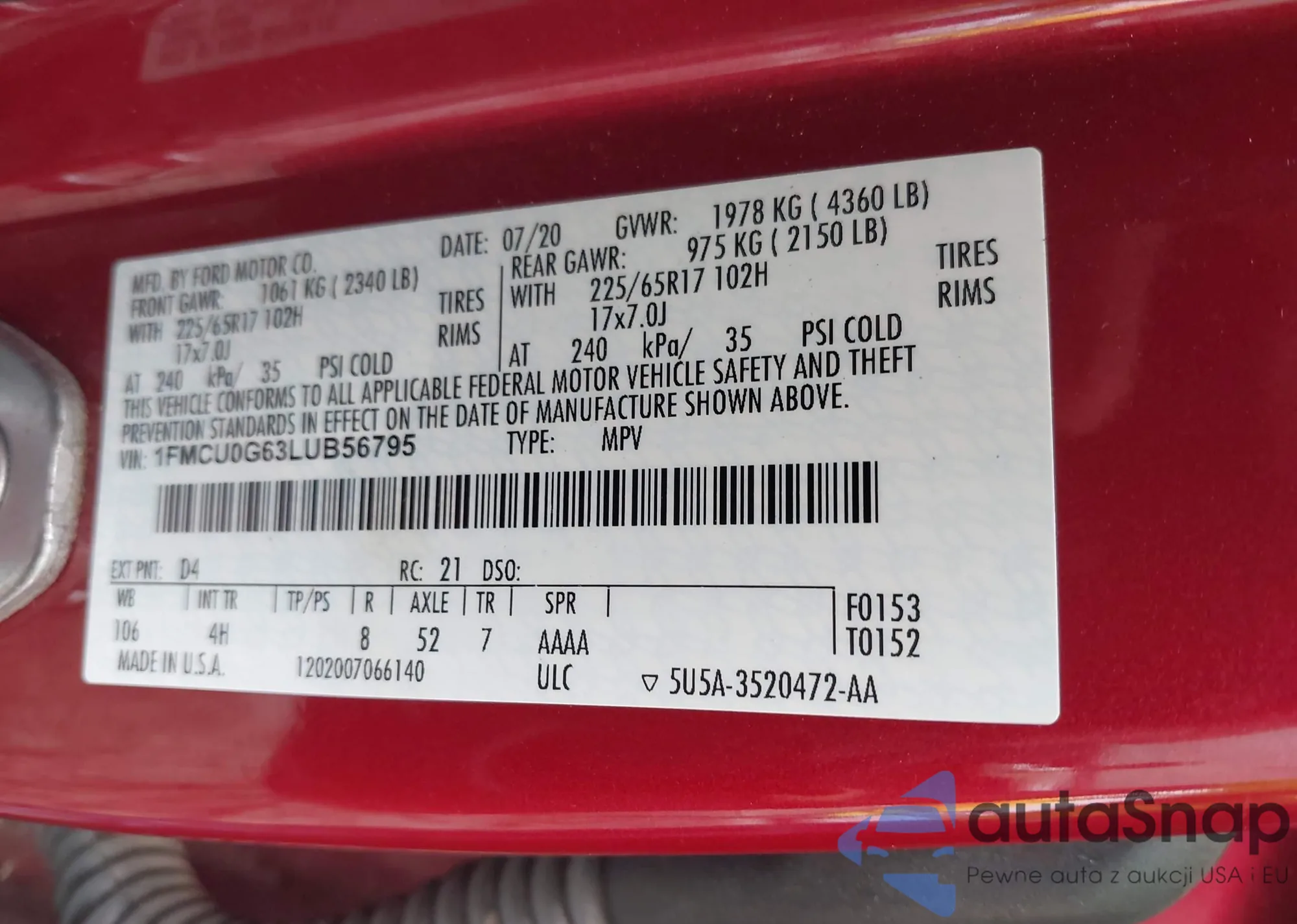 VIN: 1FMCU0G63LUB56795